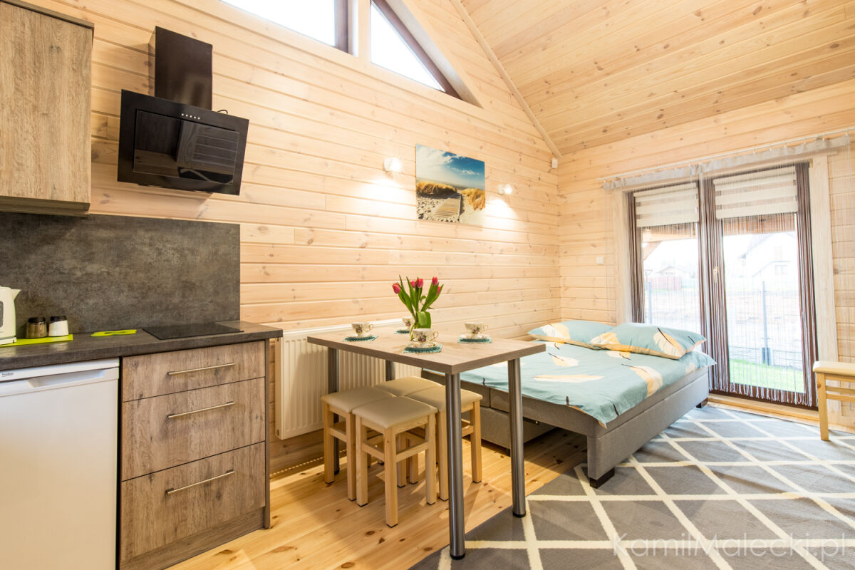 W domku 8 osobowym na parterze znajduje się salon z aneksem kuchennym i łazienka a na piętrze są 2 sypialnie .