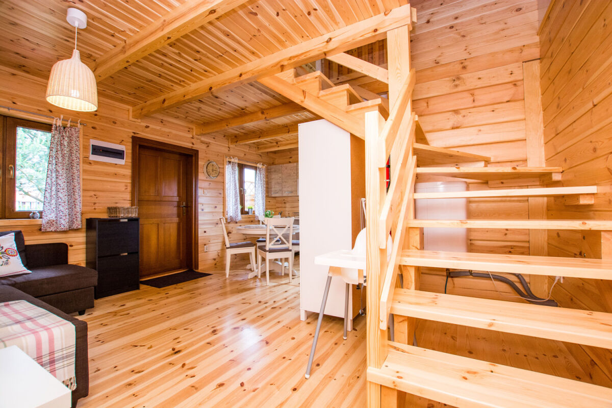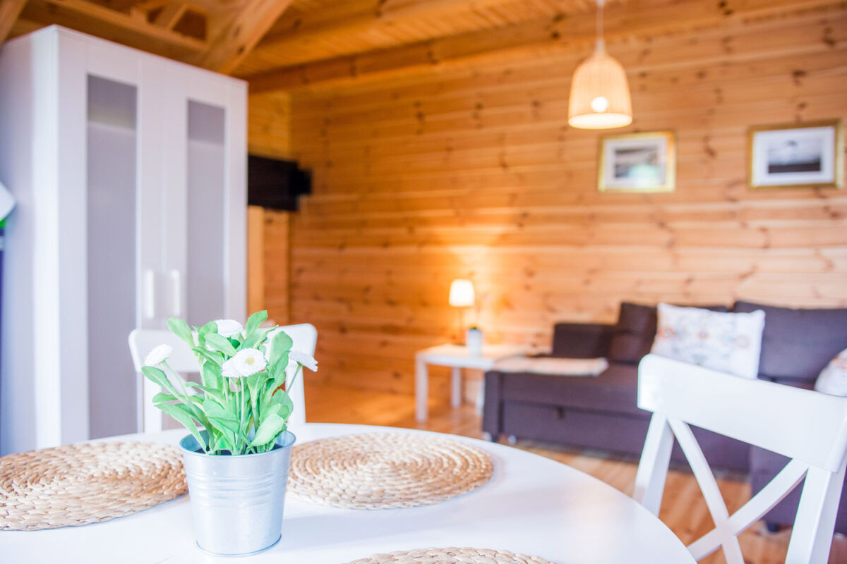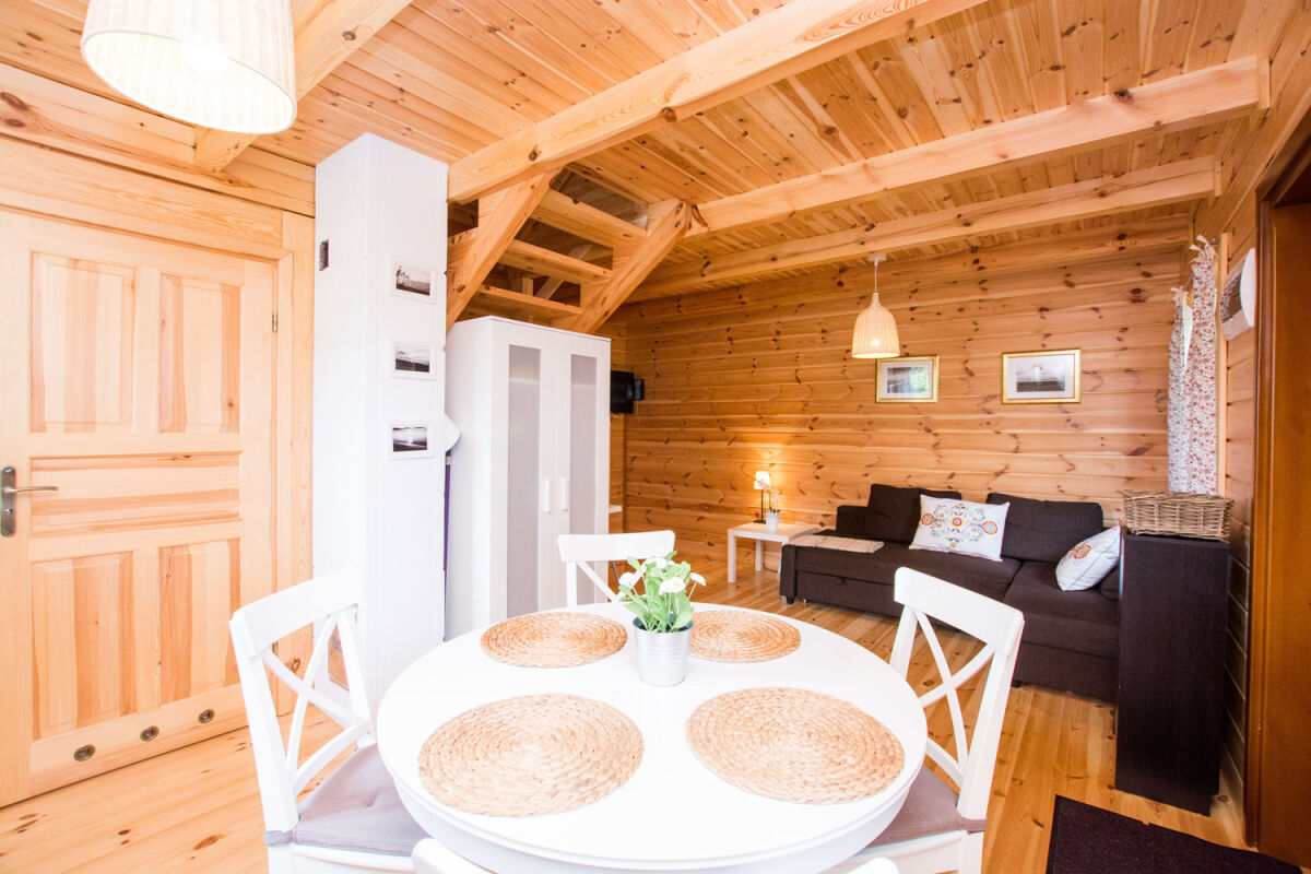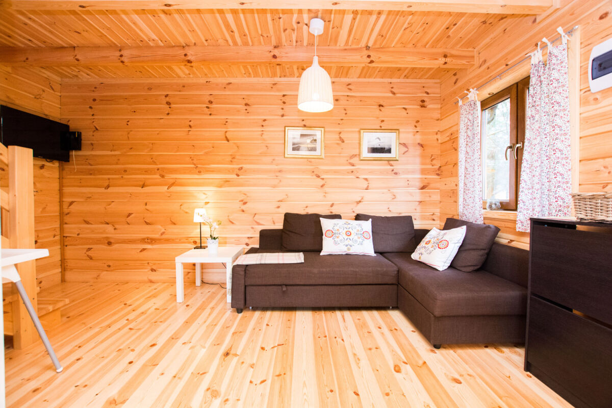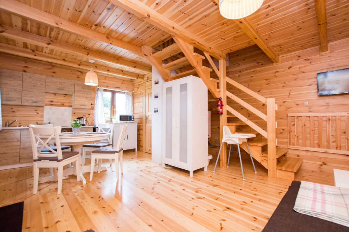 Na parterze domków drewnianych znajduje się salon z rozkładanym narożnikiem (możliwość spania dla 2 osób), aneks kuchenny oraz łazienka. Na piętrze dwie sypialnie (łóżko małżeńskie, rozkładany fotel oraz dwa oddzielne łóżka pojedyncze). Wysoki poziom wyposażenia domków spełni oczekiwania nawet najbardziej wymagających gości.