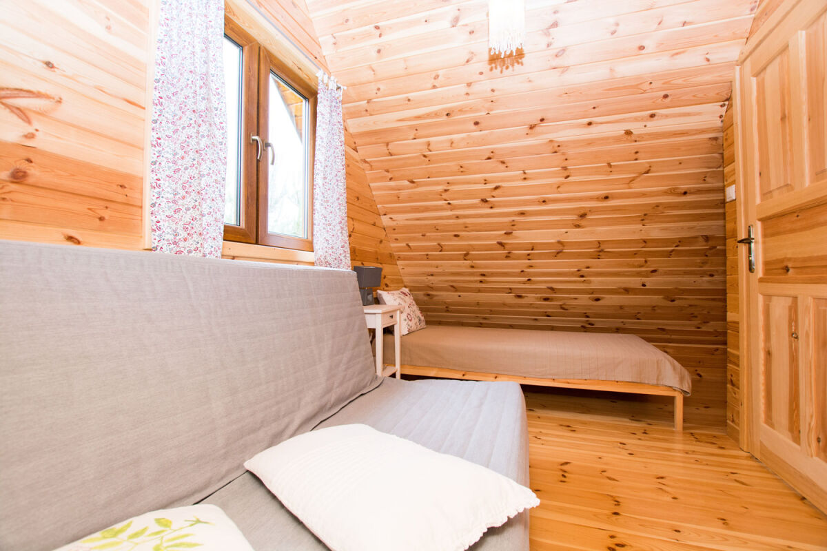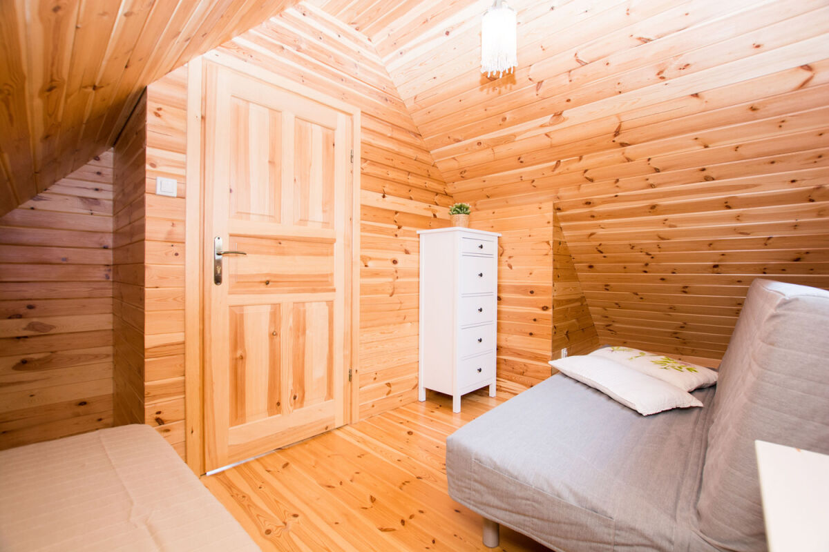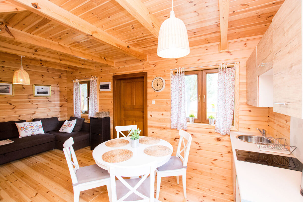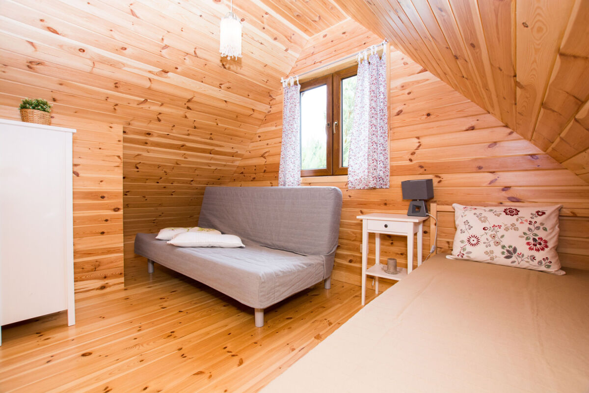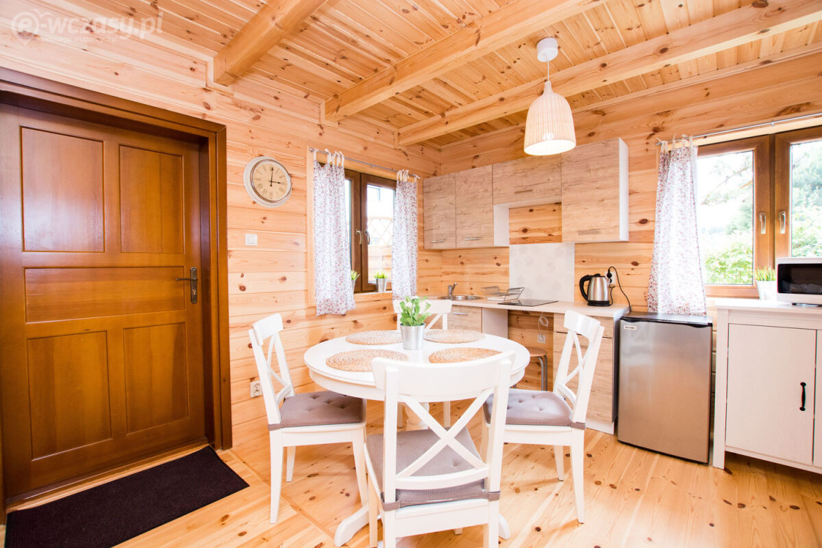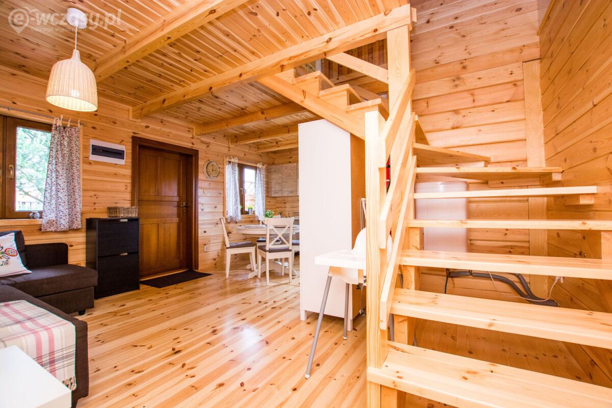 Na parterze domków drewnianych znajduje się salon z rozkładanym narożnikiem (możliwość spania dla 2 osób), aneks kuchenny oraz łazienka. Na piętrze dwie sypialnie (łóżko małżeńskie, rozkładany fotel oraz dwa oddzielne łóżka pojedyncze). Wysoki poziom wyposażenia domków spełni oczekiwania nawet najbardziej wymagających gości.