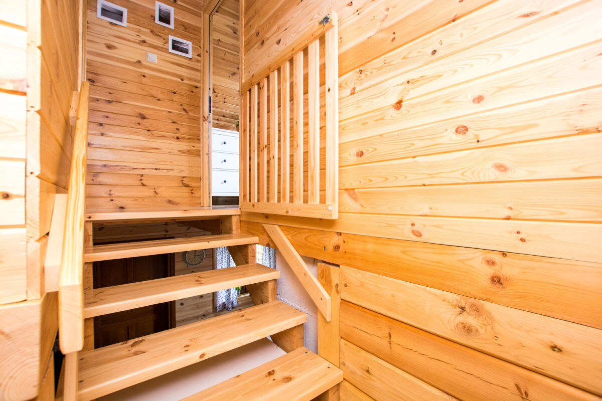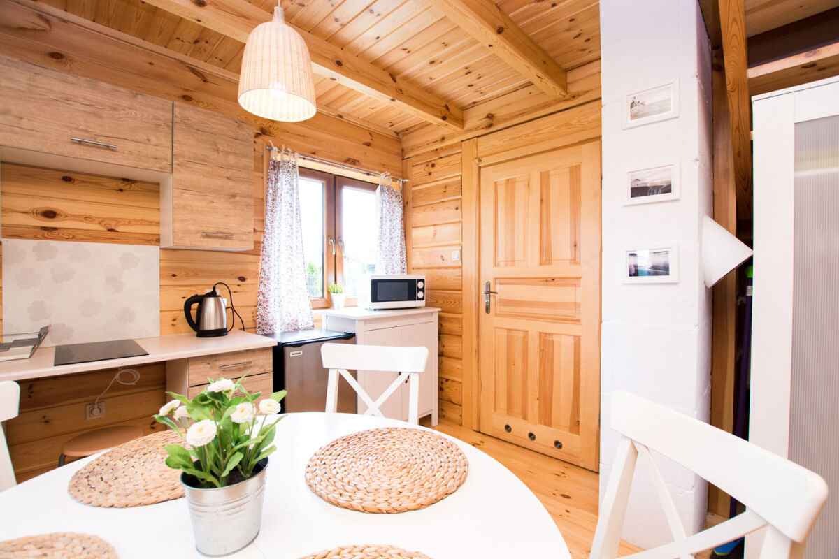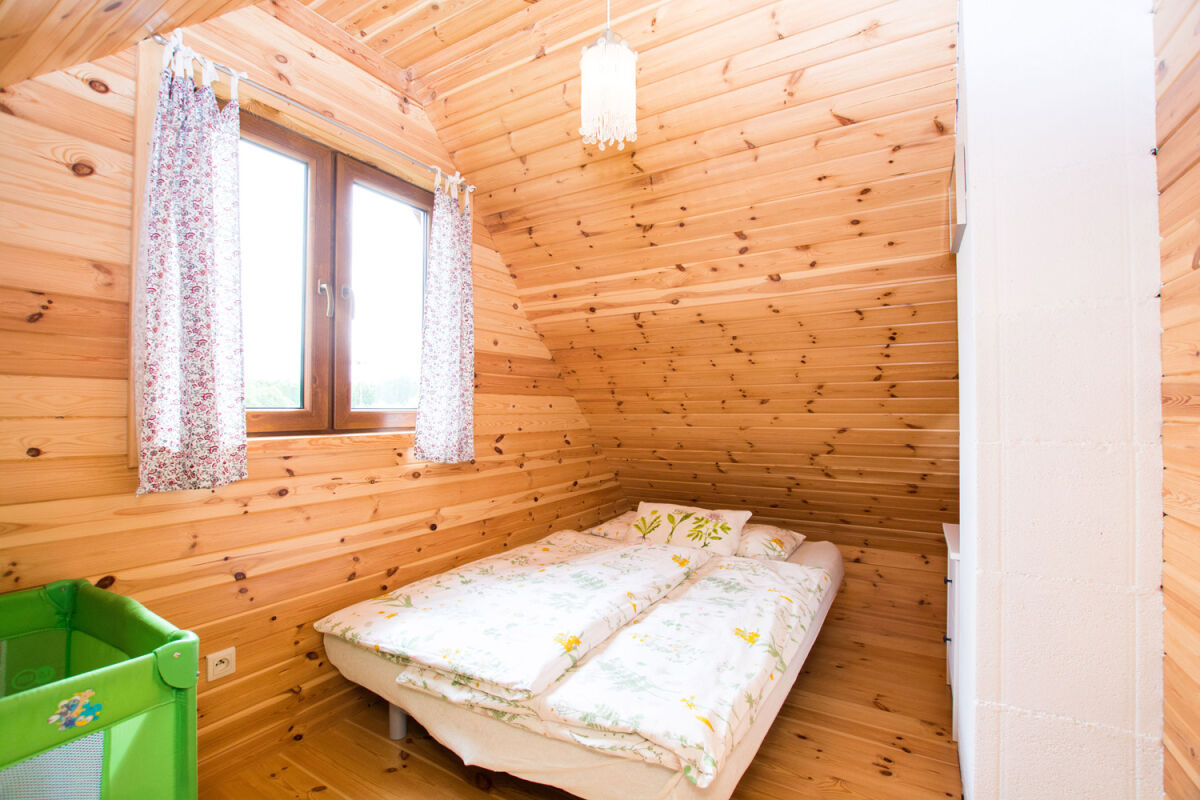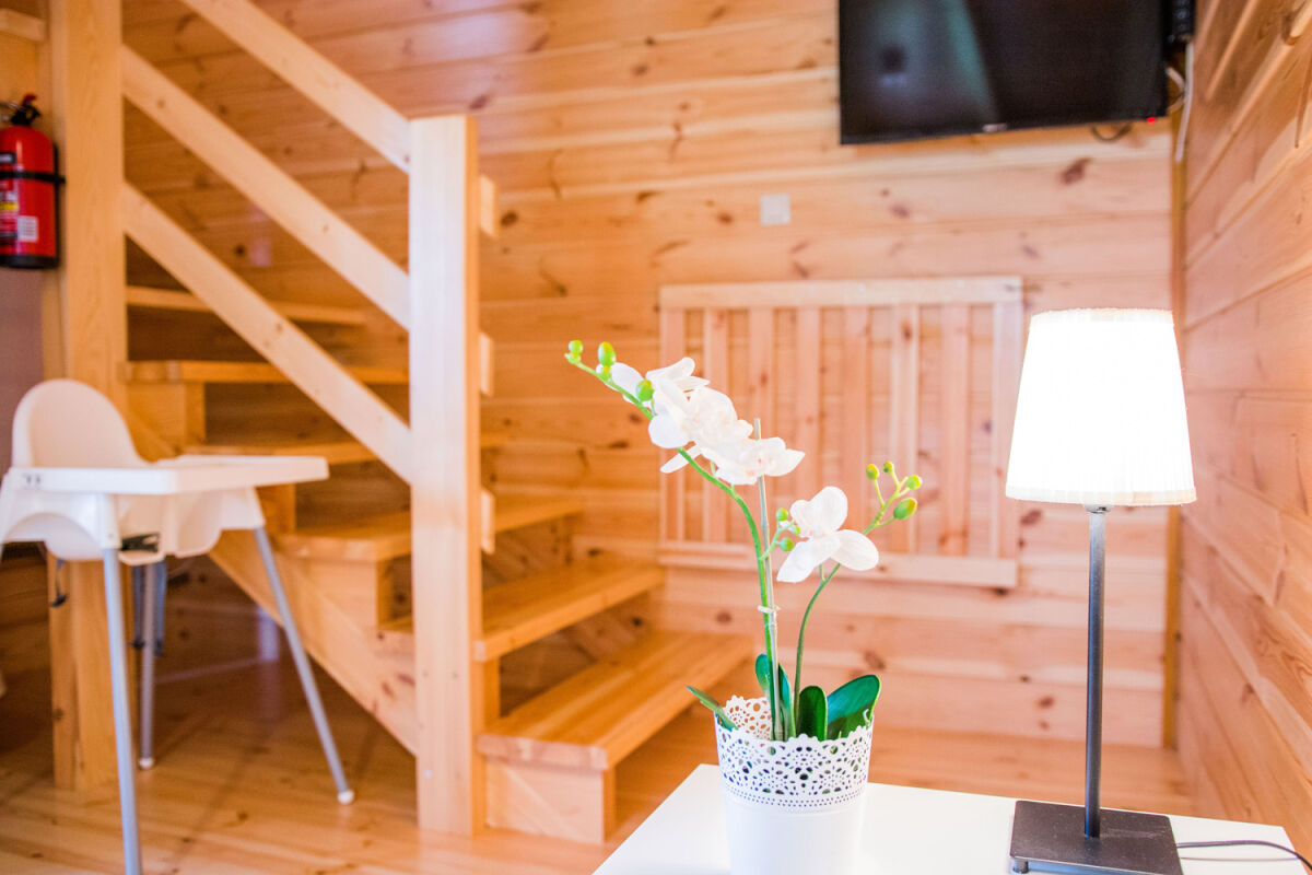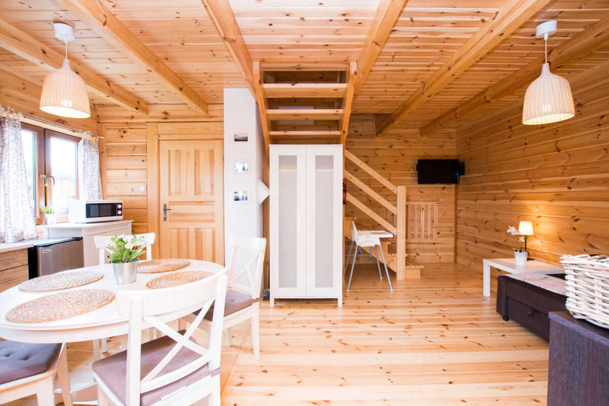 Na parterze domków drewnianych znajduje się salon z rozkładanym narożnikiem (możliwość spania dla 2 osób), aneks kuchenny oraz łazienka. Na piętrze dwie sypialnie (łóżko małżeńskie, rozkładany fotel oraz dwa oddzielne łóżka pojedyncze). Wysoki poziom wyposażenia domków spełni oczekiwania nawet najbardziej wymagających gości.