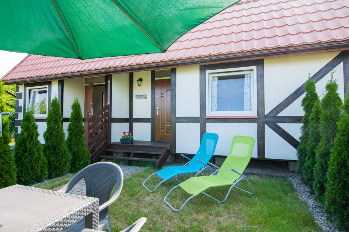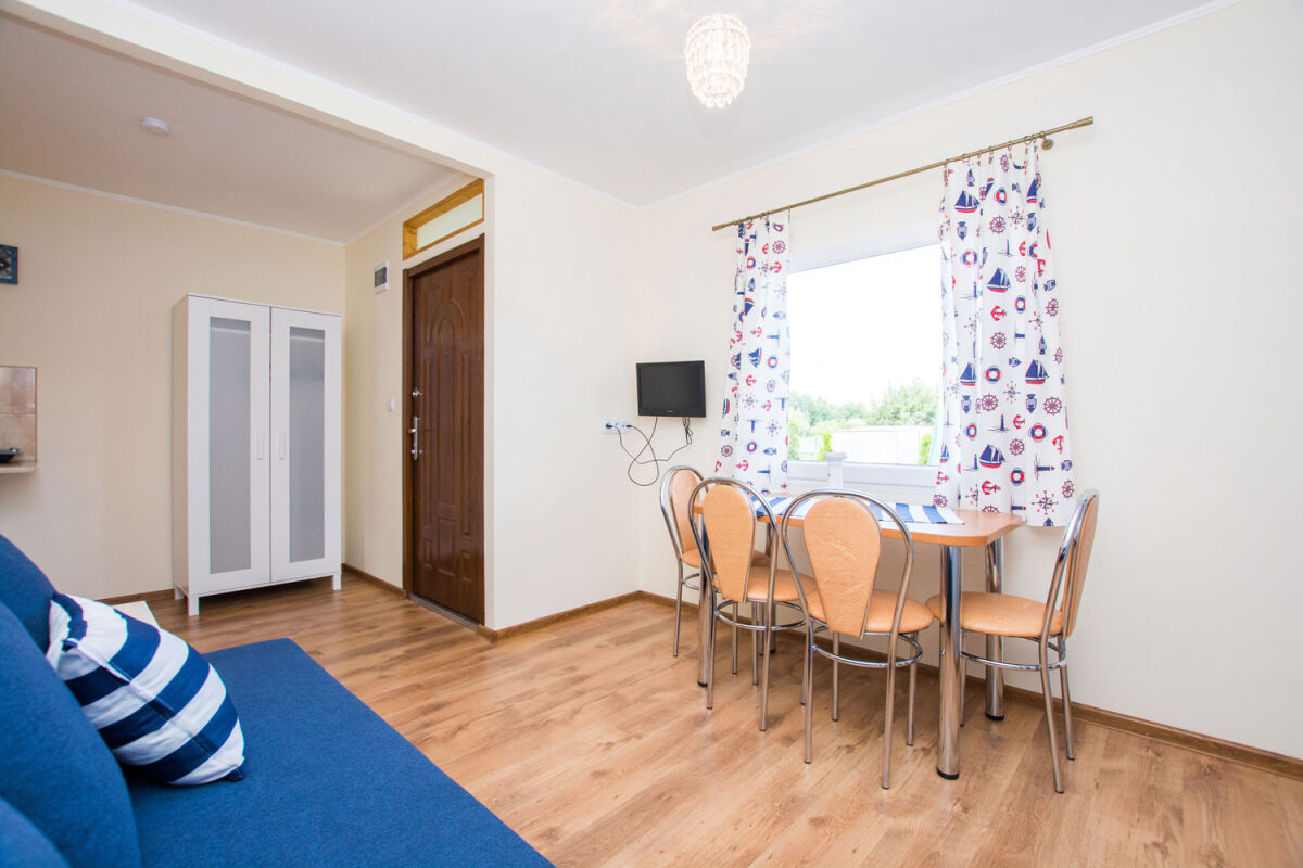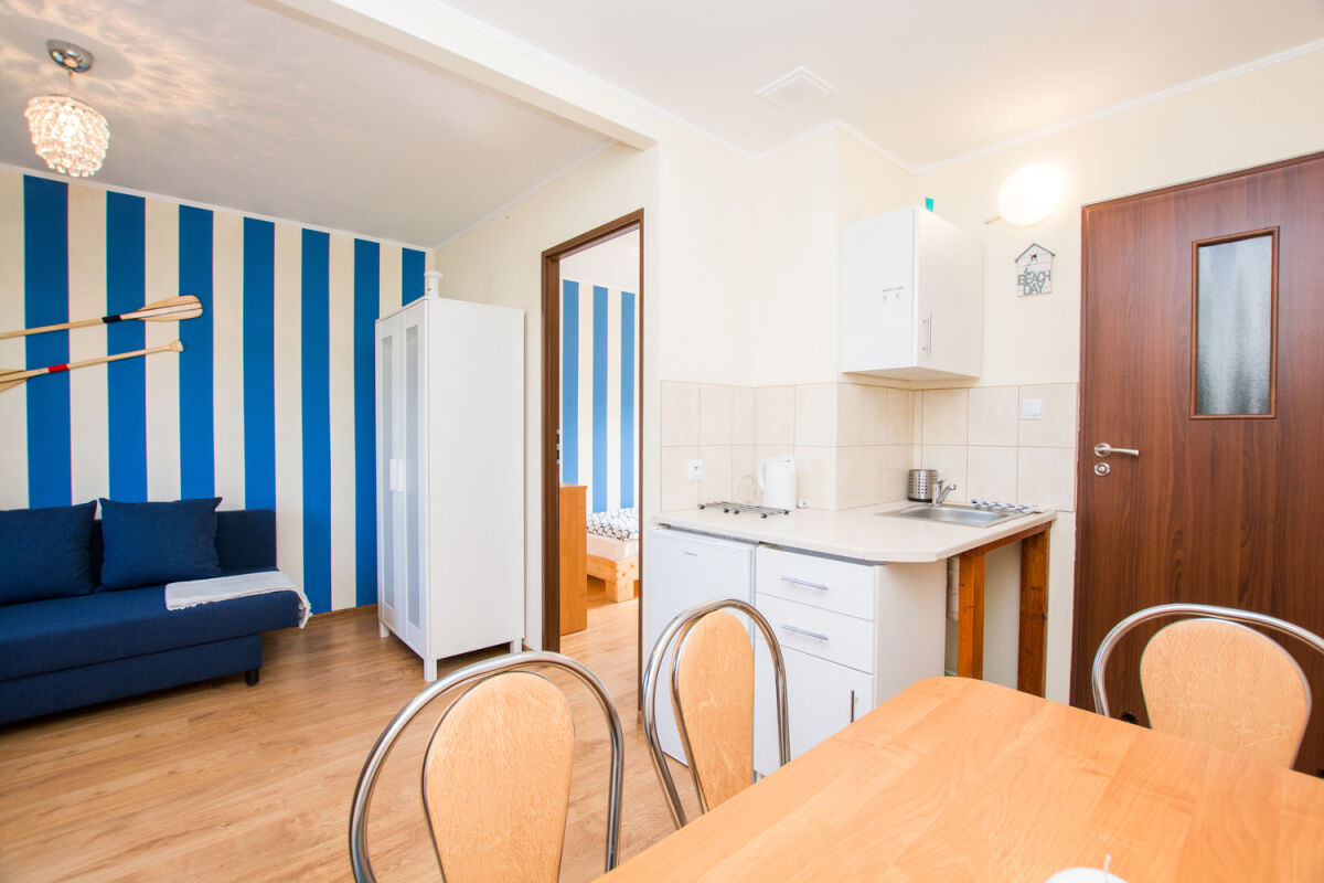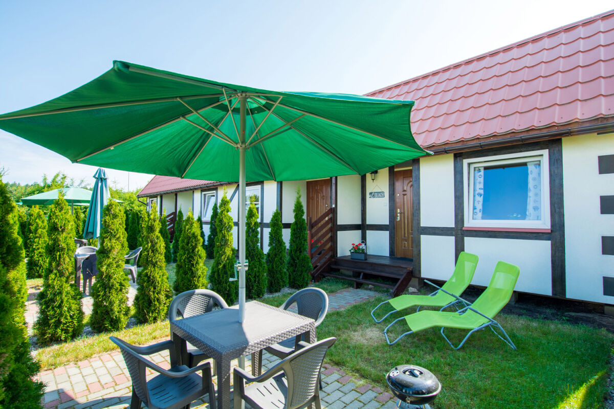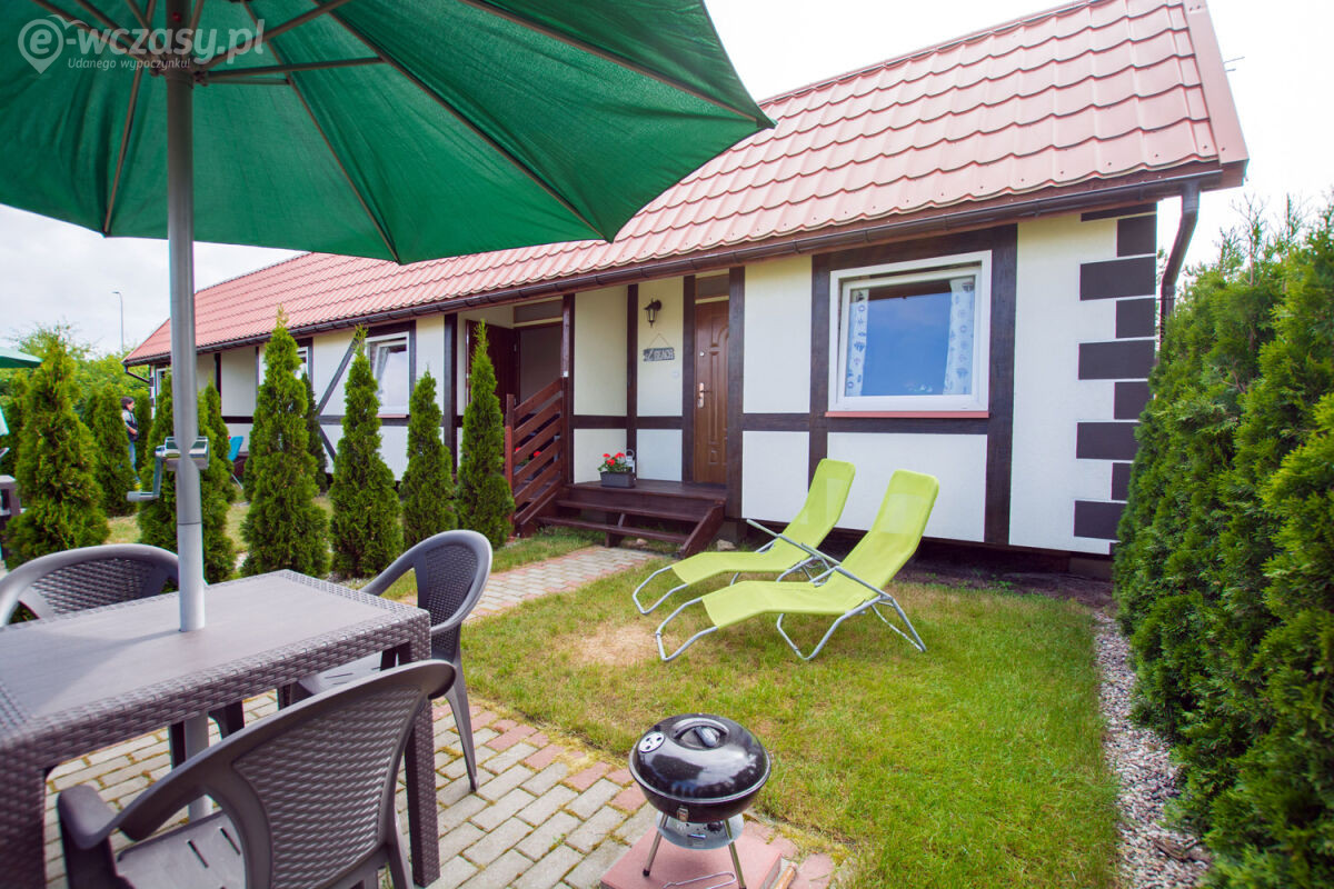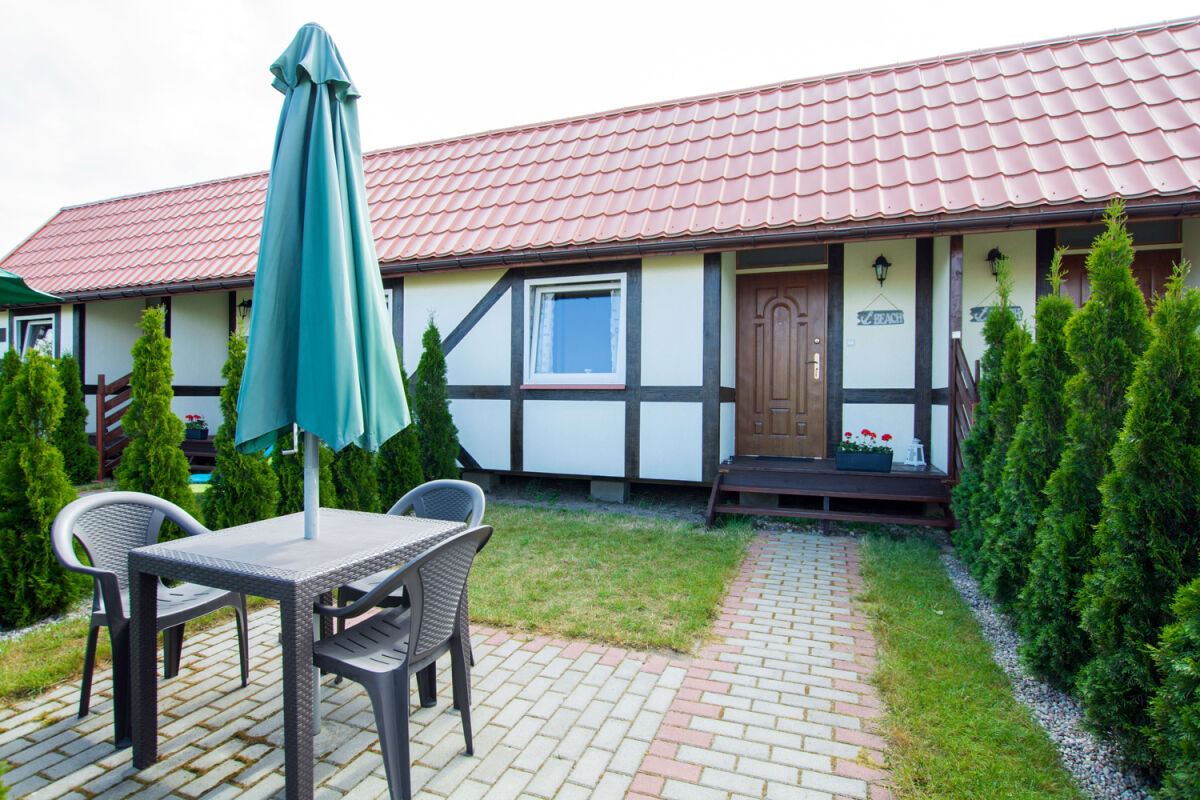 Posiadamy cztery parterowe domki w stylu marynistycznym. Każdy z nich posiada aneks kuchenny (kuchenka ceramiczna 2 palnikowa, zestaw talerzy i sztućców, komplet garnków, kieliszki, czajnik elektryczny, ściereczki, lodówka, suszarka do suszenia prania).
