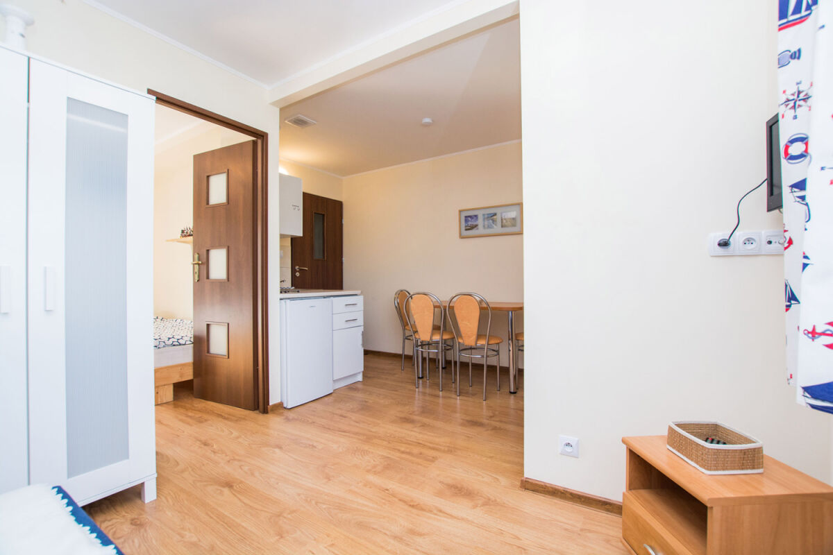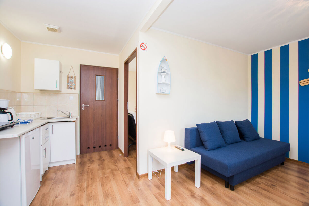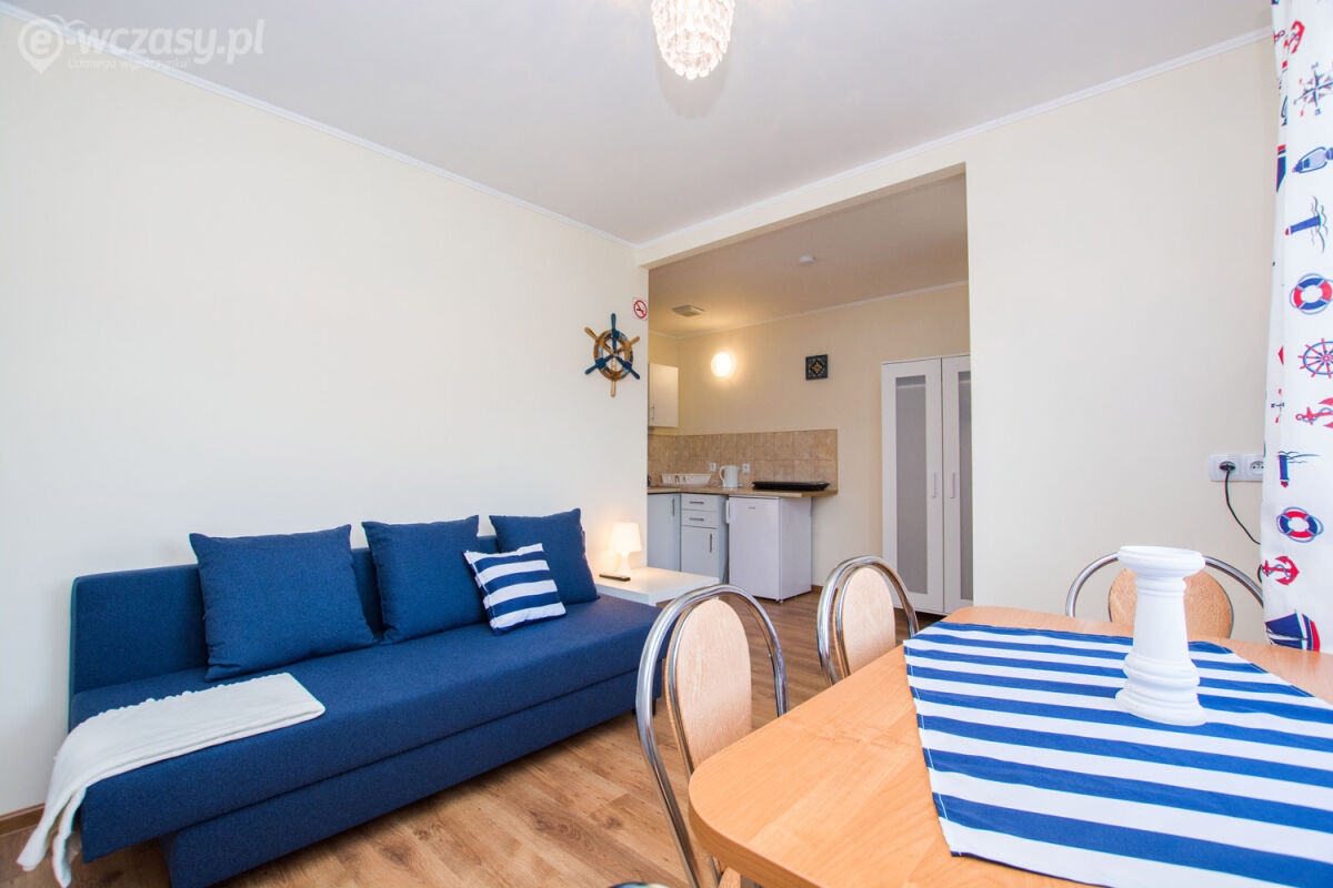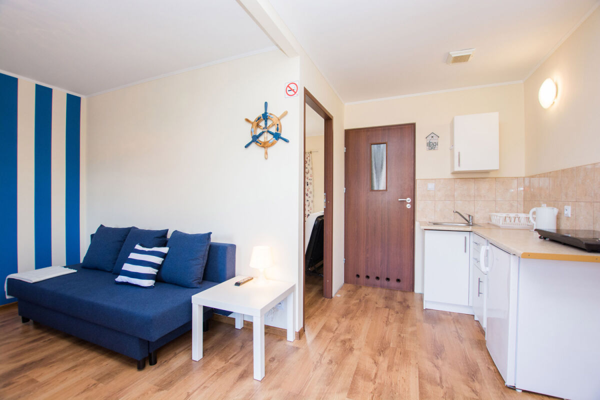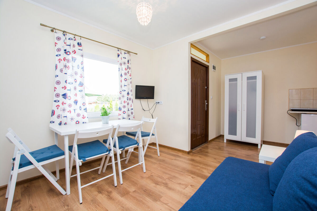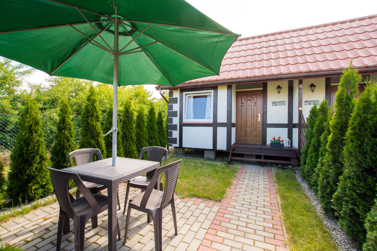 Posiadamy cztery parterowe domki w stylu marynistycznym. Każdy z nich posiada aneks kuchenny (kuchenka ceramiczna 2 palnikowa, zestaw talerzy i sztućców, komplet garnków, kieliszki, czajnik elektryczny, ściereczki, lodówka, suszarka do suszenia prania).