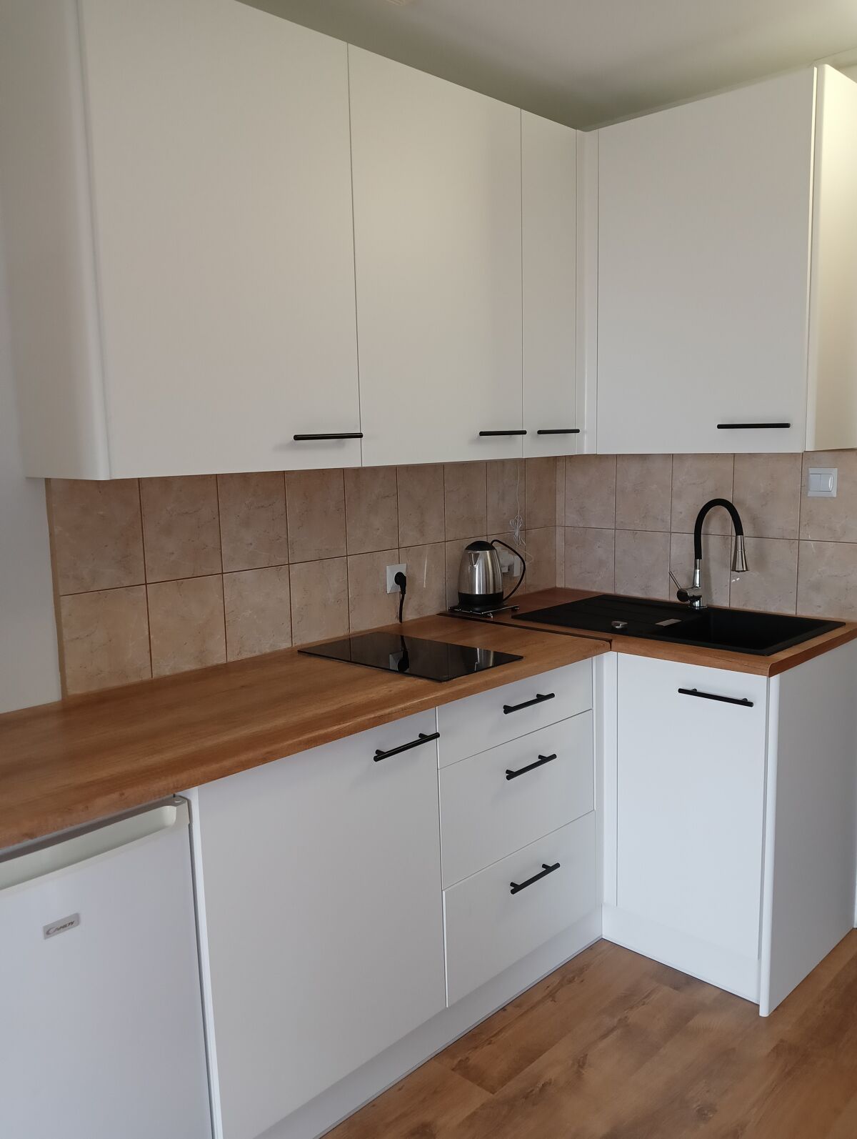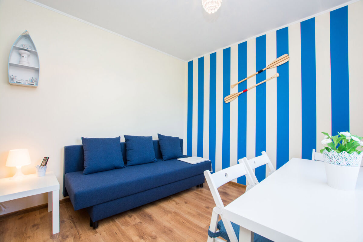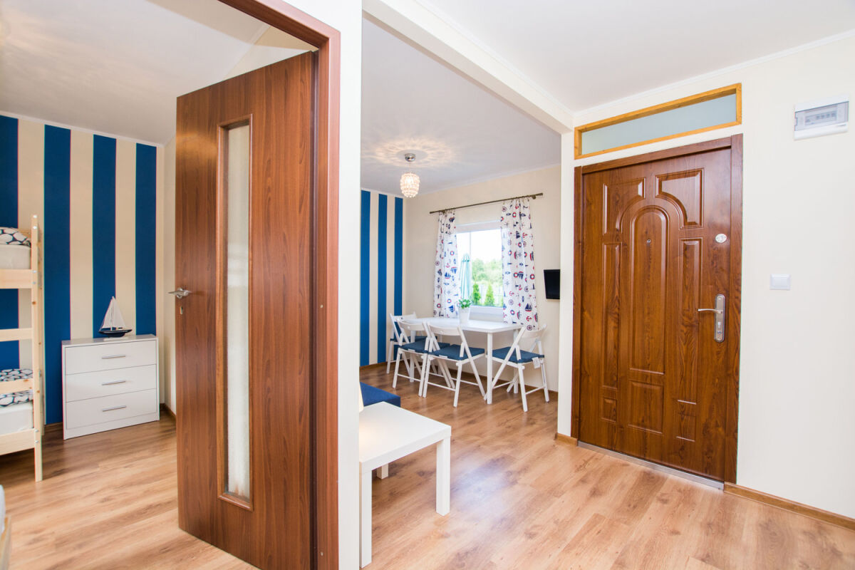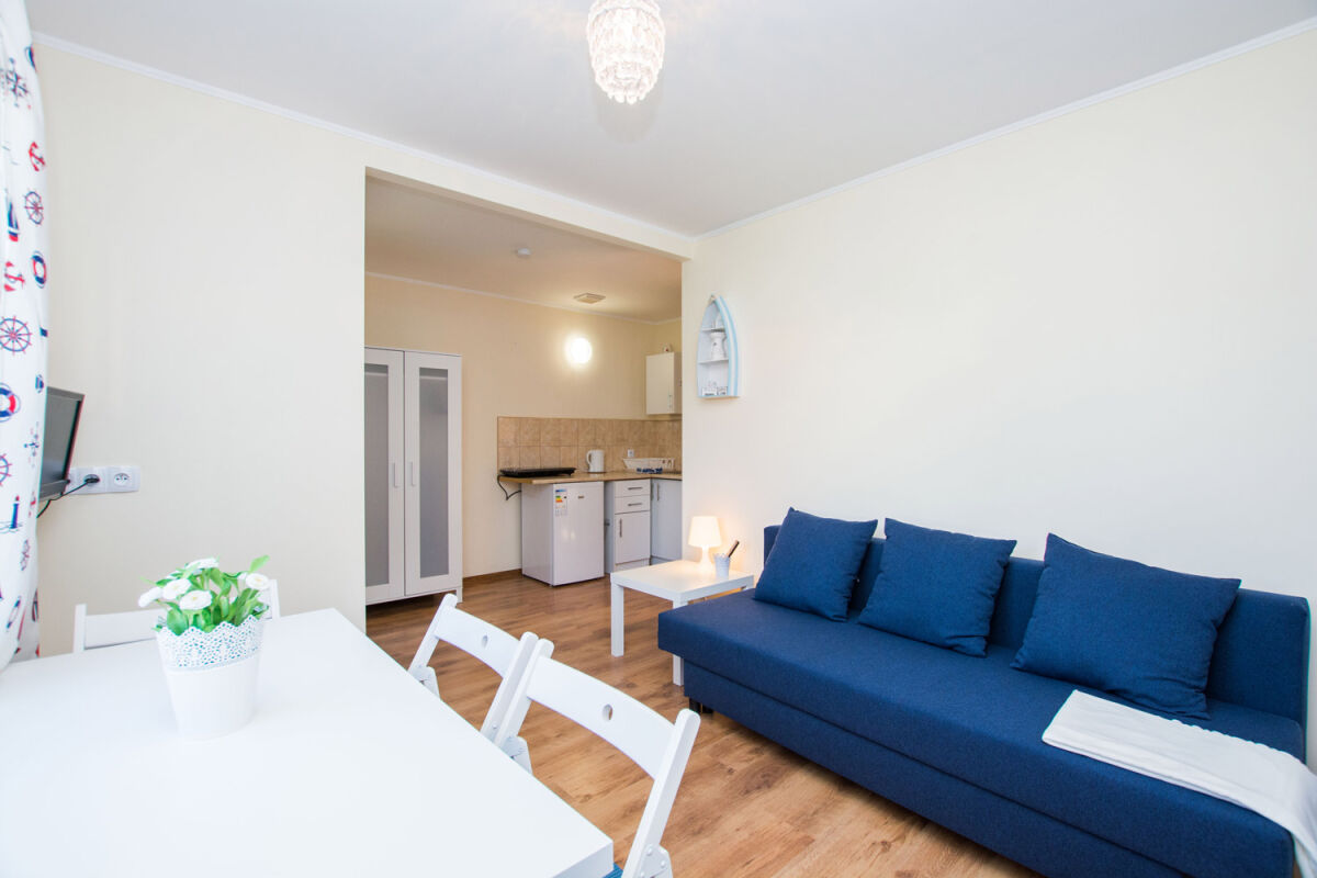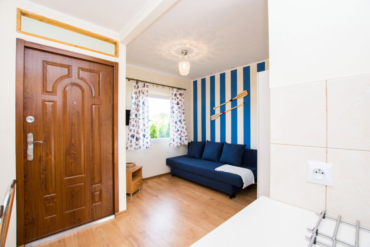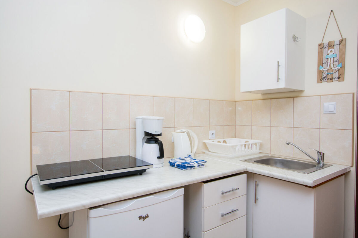 Posiadamy cztery parterowe domki w stylu marynistycznym. Każdy z nich posiada aneks kuchenny (kuchenka ceramiczna 2 palnikowa, zestaw talerzy i sztućców, komplet garnków, kieliszki, czajnik elektryczny, ściereczki, lodówka, suszarka do suszenia prania).