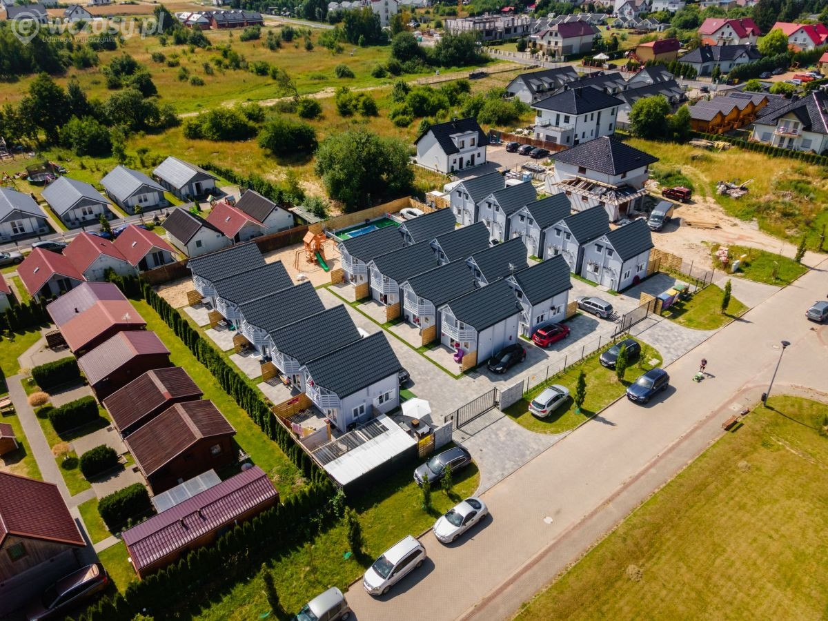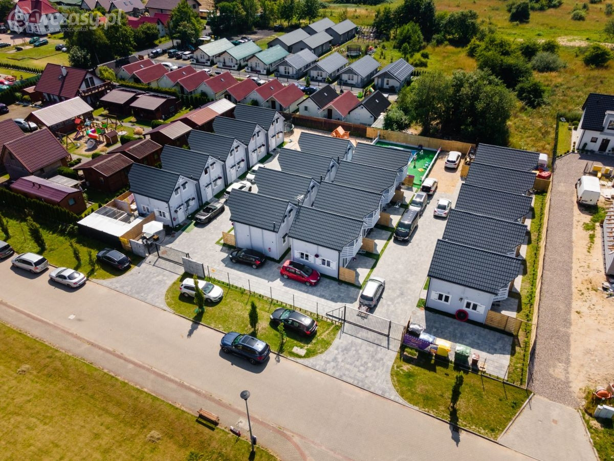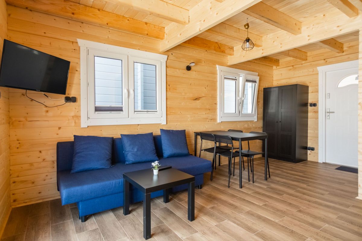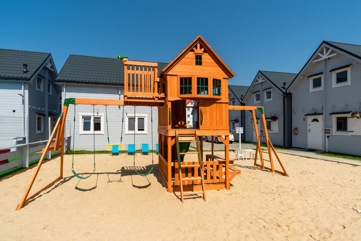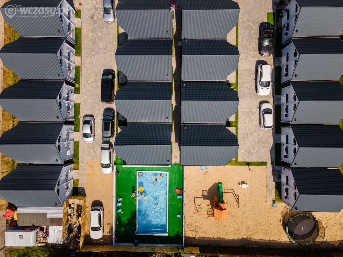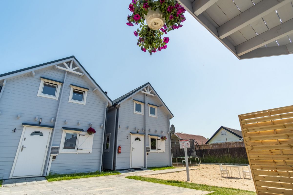 Na parterze znajduje się przestronny pokój dzienny połączony z kuchnią oraz łazienka z prysznicem. Na piętrze znajdują się 2 oddzielne sypialnie (w tym 1 z balkonem) oraz druga łazienka, tym razem z wanną. Przed każdym z domków jest zadaszony taras z kompletem mebli ogrodowych oraz sprzętem do grillowania.