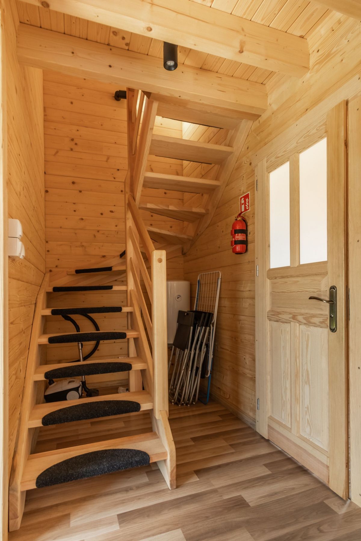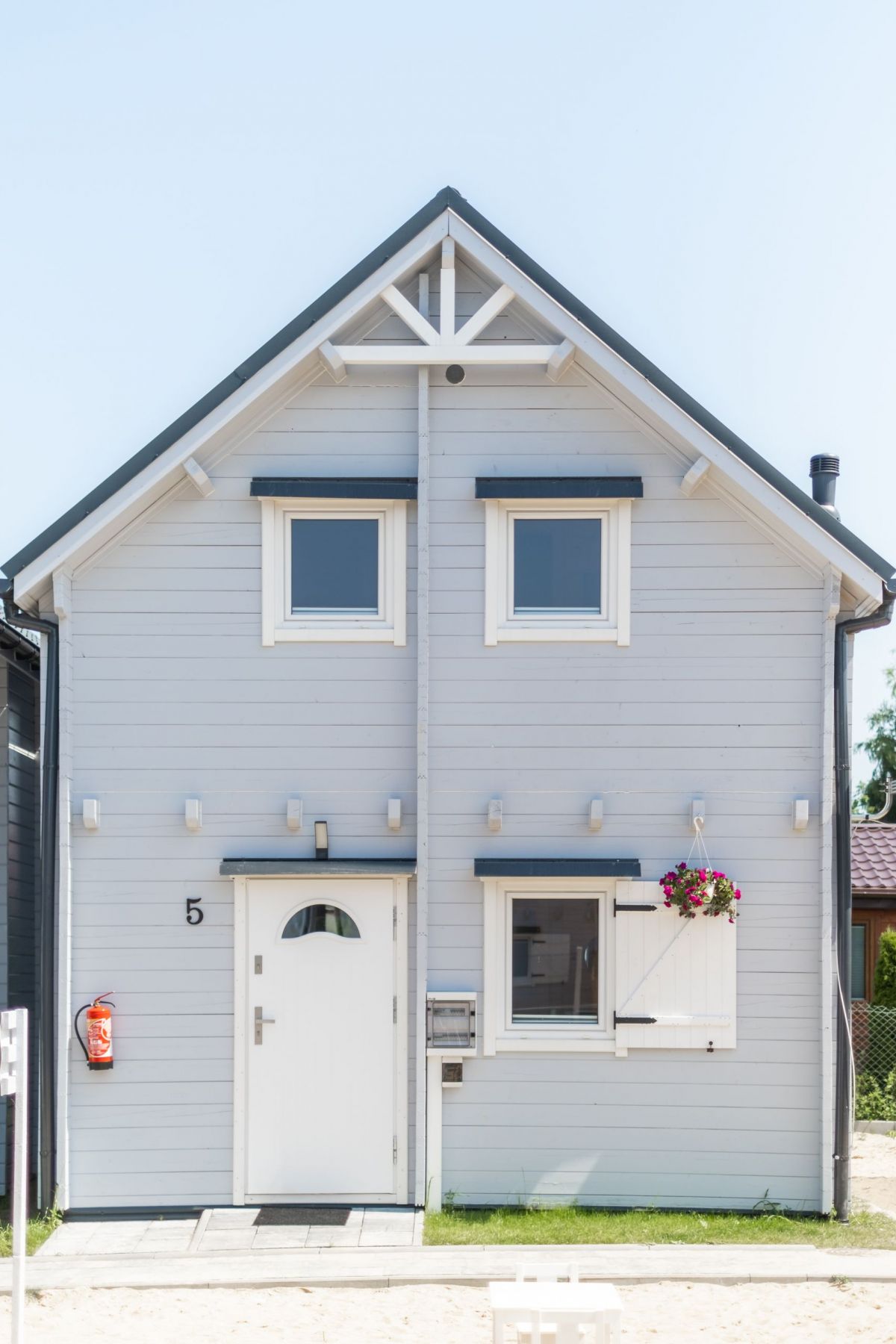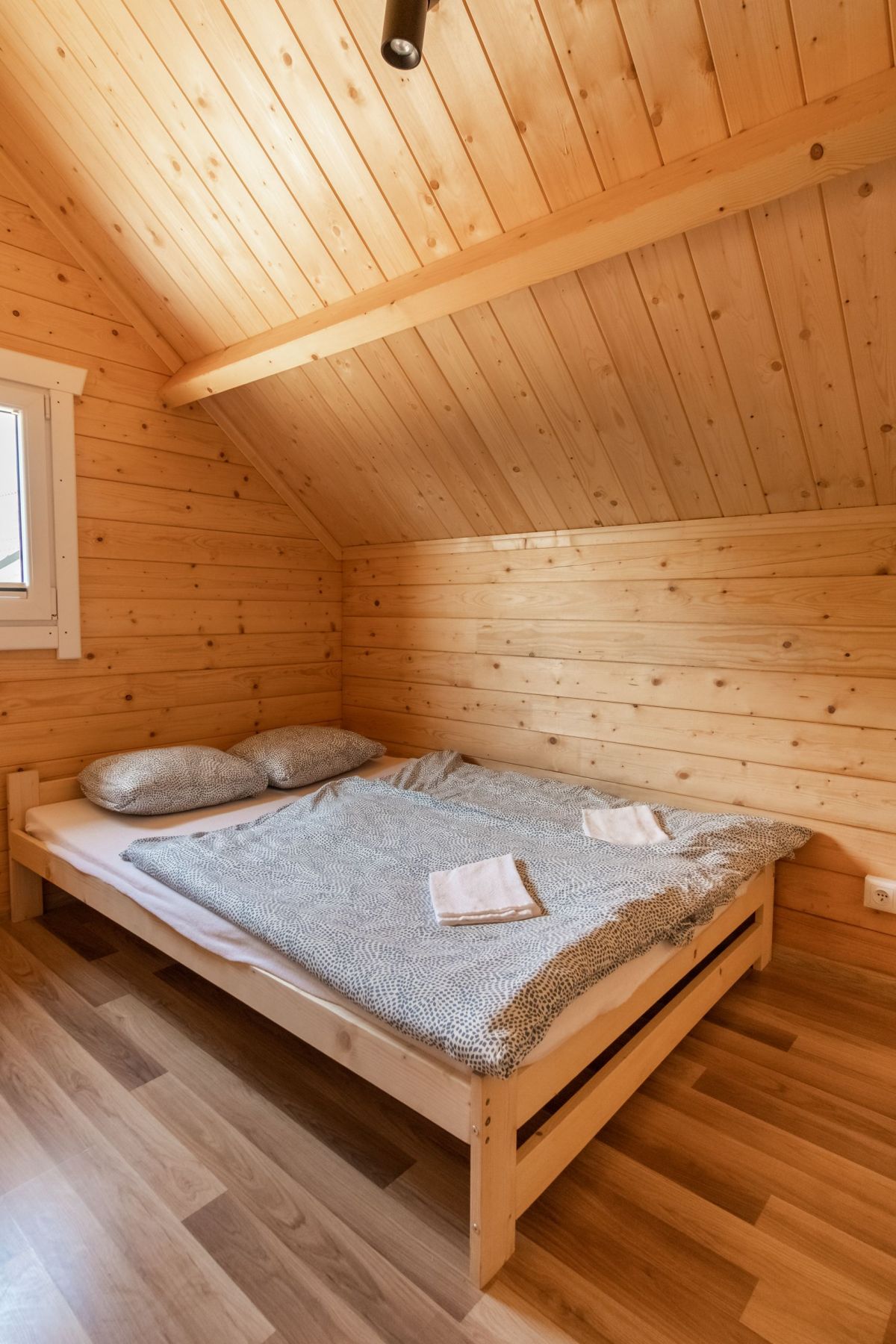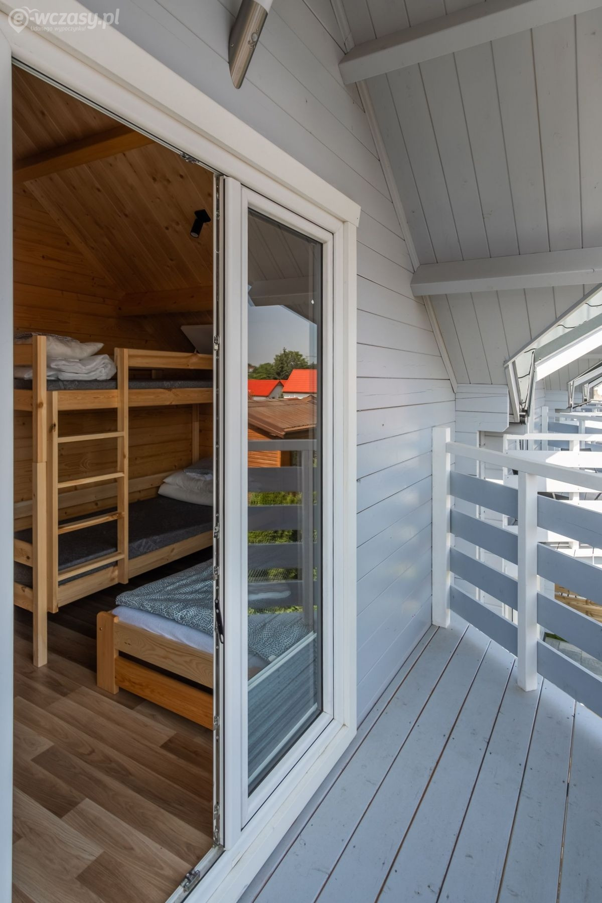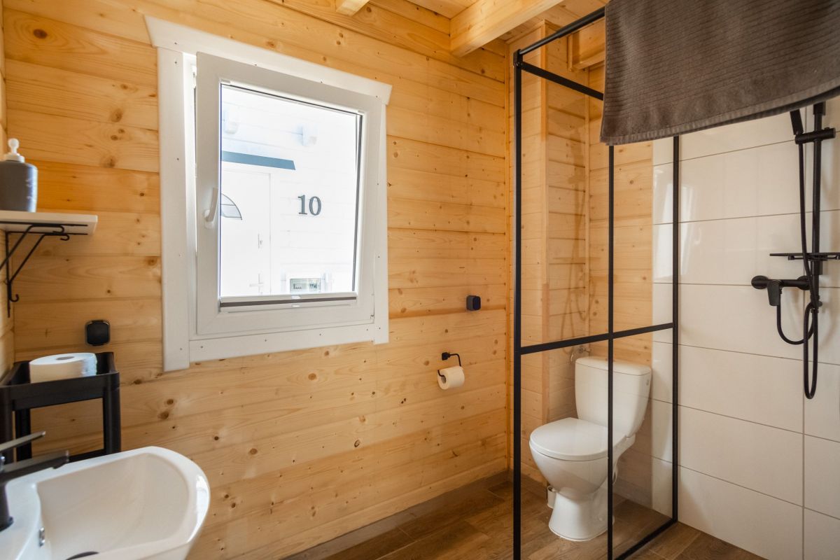 Na parterze znajduje się przestronny pokój dzienny połączony z kuchnią oraz łazienka z prysznicem. Na piętrze znajdują się 2 oddzielne sypialnie (w tym 1 z balkonem) oraz druga łazienka, tym razem z wanną. Przed każdym z domków jest zadaszony taras z kompletem mebli ogrodowych oraz sprzętem do grillowania.