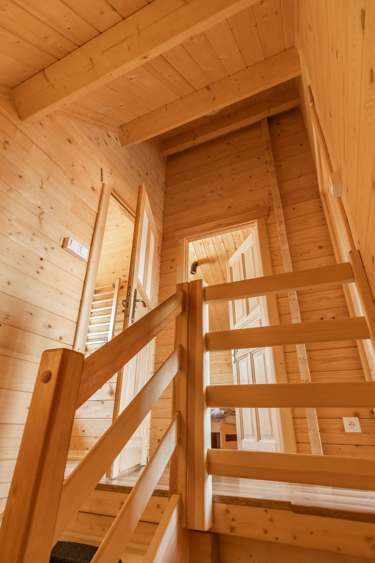 Rozkład miejsc noclegowych jest następujący - na parterze rozkładana 2 osobowa sofa, natomiast na pierwszym piętrze: - w pierwszym pokoju dwa łóżka pojedyncze oraz jedno łóżko piętrowe z dwoma miejscami do spania, w drugim pokoju znajduje się łóżko dwuosobowe (małżeńskie).