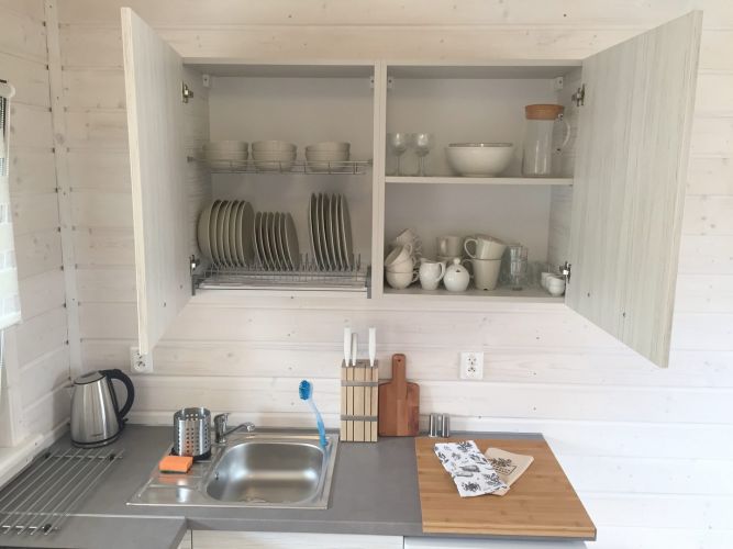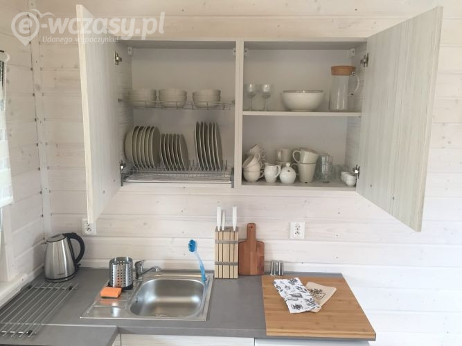 Każdy domek wyposażony jest w klimatyzację i znajdują się w nim dwie sypialnie (2 i 3 osobowa), aneks kuchenny z niezbędnym sprzętem (lodówka, płyta indukcyjna, zastawa stołowa i czajnik elektryczny), łazienka z pełnym węzłem sanitarnym oraz salon z telewizorem. Przed wejściem do domku jest niewielki, zadaszony taras z kompletem biesiadnym. Istnieje możliwość wykorzystania pokoju dziennego jako sypialni dla dodatkowej osoby, co pozwala na bezproblemowe zakwaterowanie 6 osób w jednym domku.