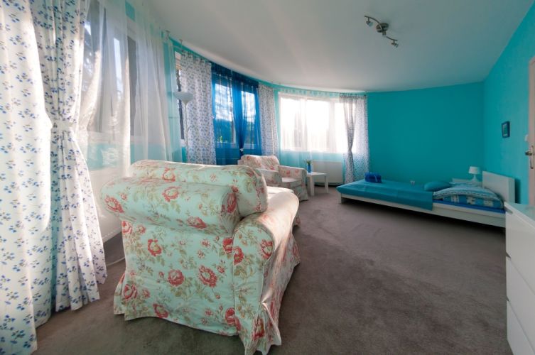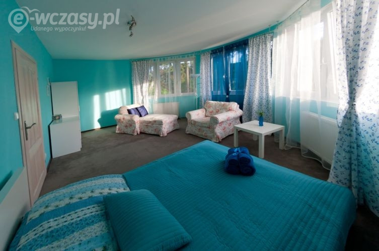 Wielki Błękit jest to apartament, największy i najbardziej luksusowy w naszej willi, ma około 40 metrów powierzchni, składa się z dwóch cześci i wspólnej łazienki. W pierwszej półokrągłej części znajduje się przestronna sypialnia z podwójnym małżeńskim łóżkiem i z kącikiem do relaksu, w drugiej części znajduje się podwójne rozkładane łóżko oraz ława i dwa fotele. Pokój wyposażony jest w telewizor, czajnik, filiżanki, ręczniki do dyspozycji Gości.