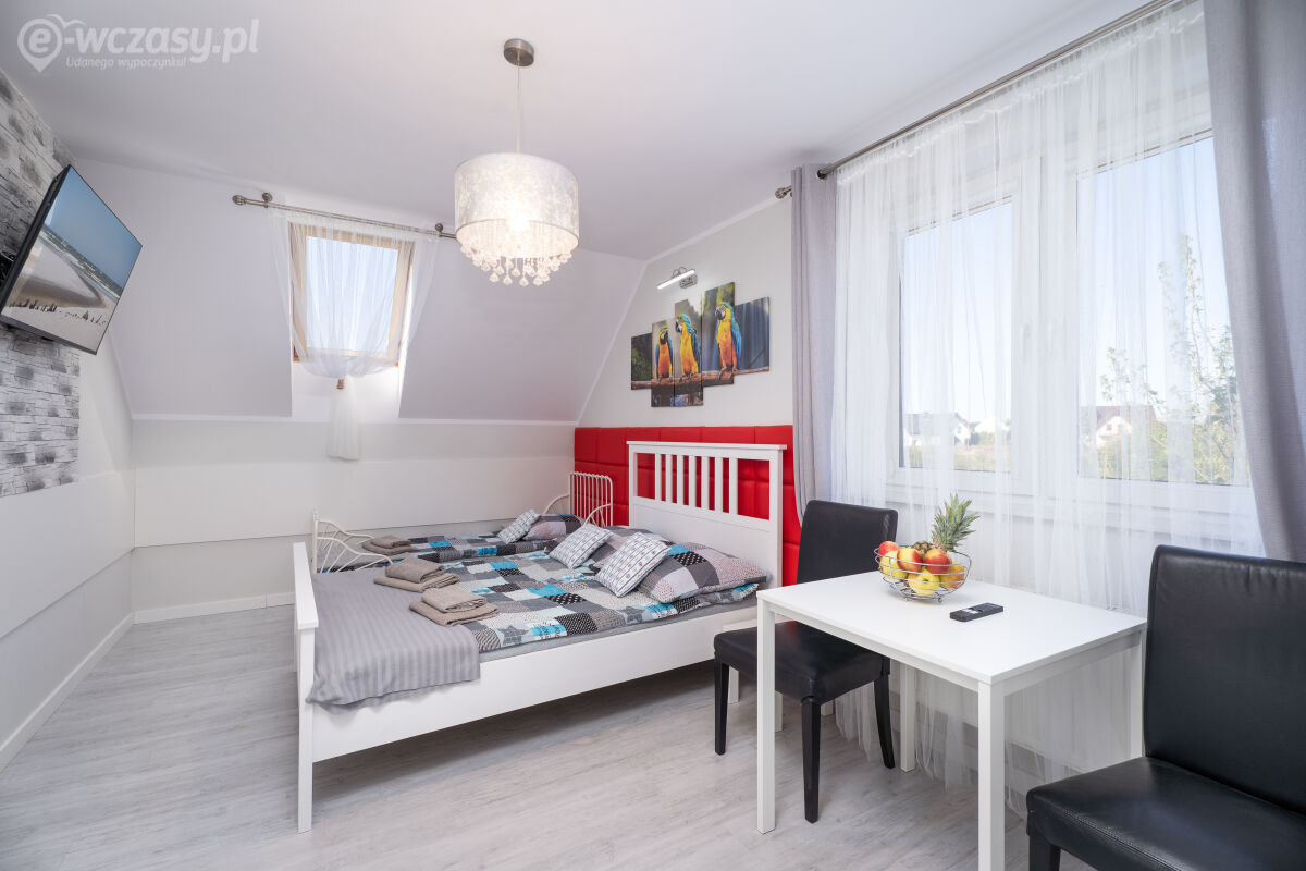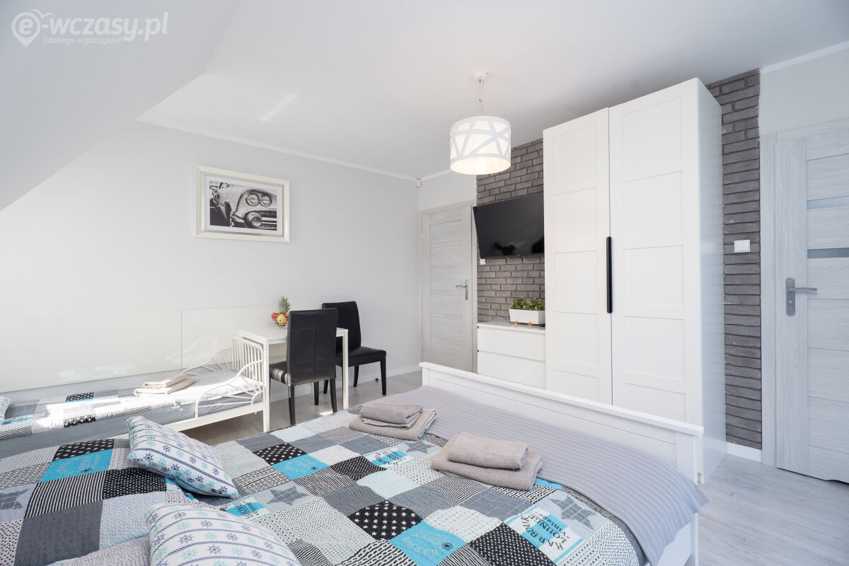 - Dwie sypialnie w każdej (1 łoże małżeńskie oraz 1 rozkładana sofa, stolik nocny, komoda, pościel, lampka nocna);