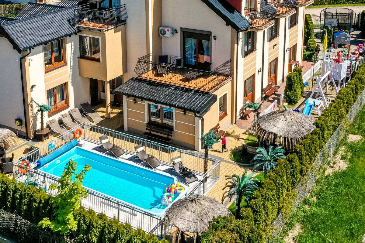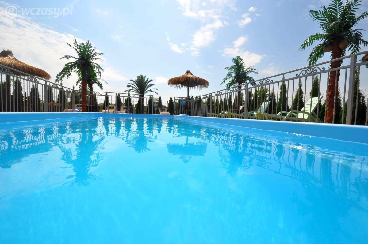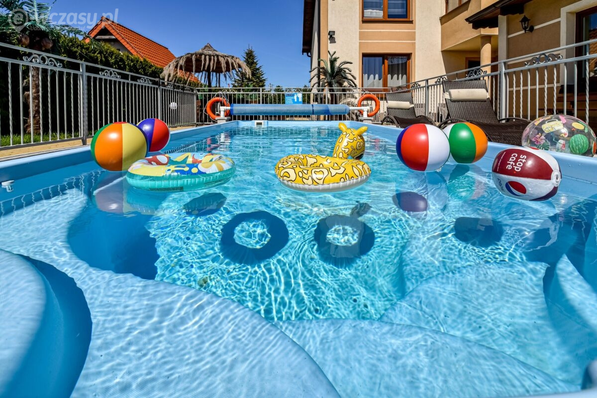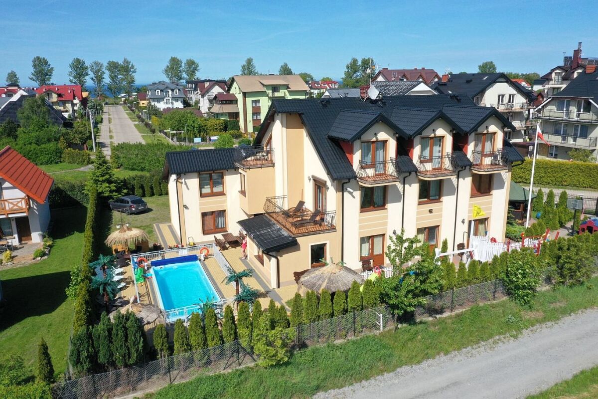 Dysponujemy bardzo nowoczesnym obiektem, z ogrzewanym basenem (temperatura wody ok 30 st.C) posiadającym, luksusowe pokoje - apartamenty, pokoje 2,3,4 osobowe z łazienkami i balkonami, sprzętem plażowym, internetem w każdym pokoju WLAN, na terenie obiektu Wi-Fi (ok 6 Mbit), dużą ogólnodostępną kuchnią na parterze, aneksem kuchennym na poddaszu, lodówkami, dużym placem zabaw z licznymi atrakcjami, dużą altaną na popołudniowe grillowanie. Dodatkowym atutem jest to, iż posesja wraz z dużym parkingiem z kostki na 12 samochodów jest ogrodzona, monitorowana i mieści się w spokojnej i cichej okolicy.