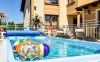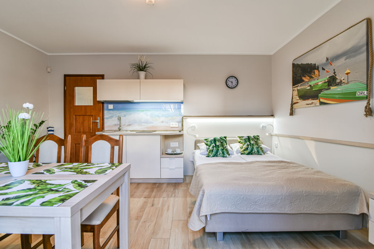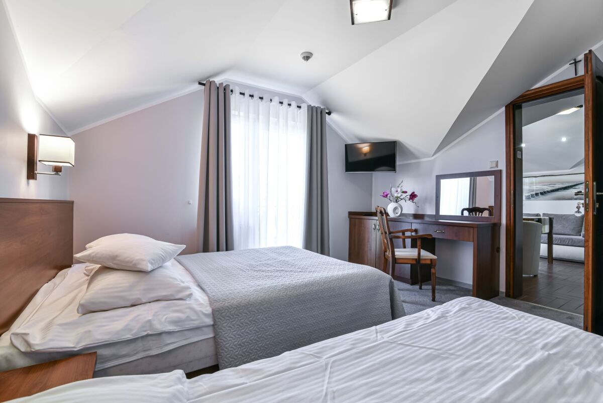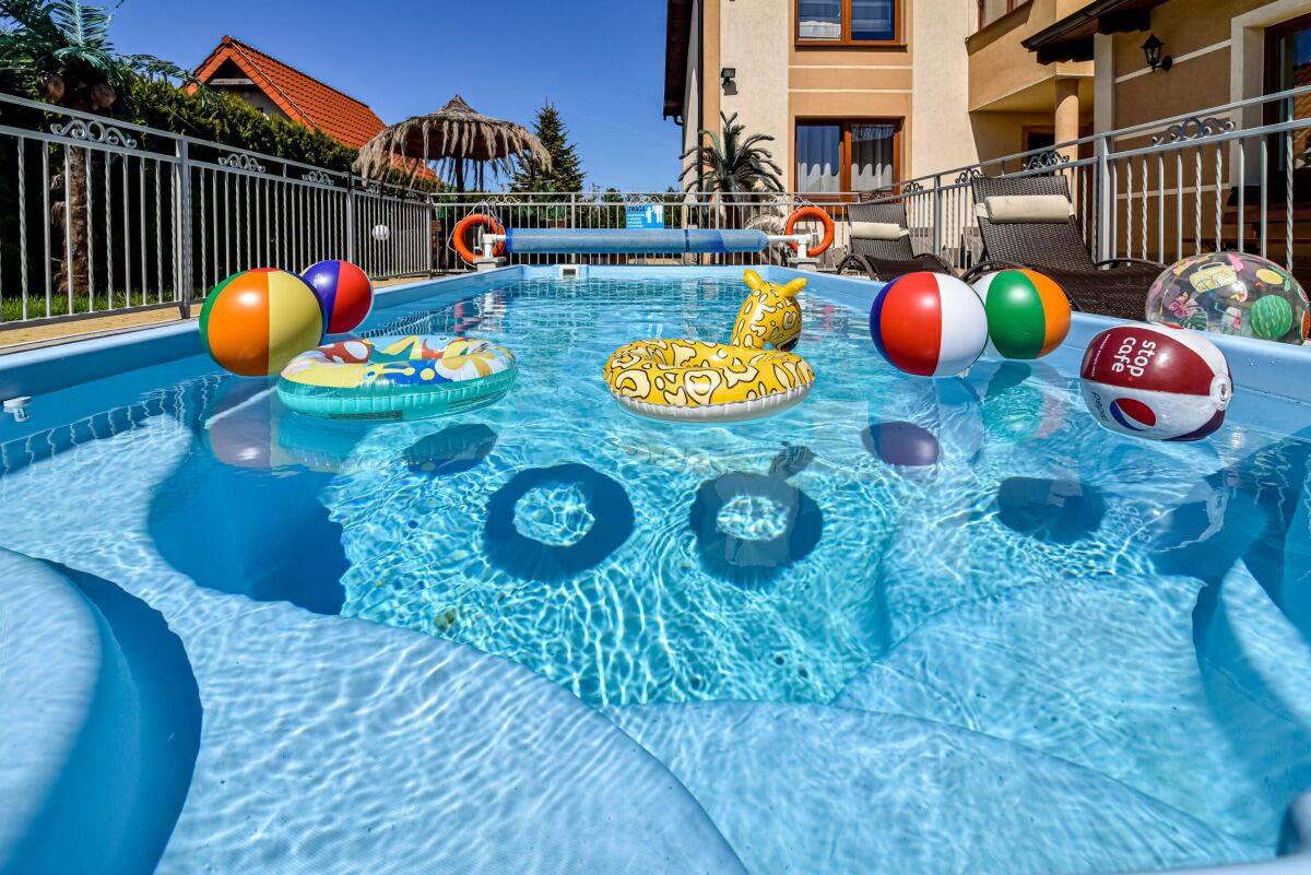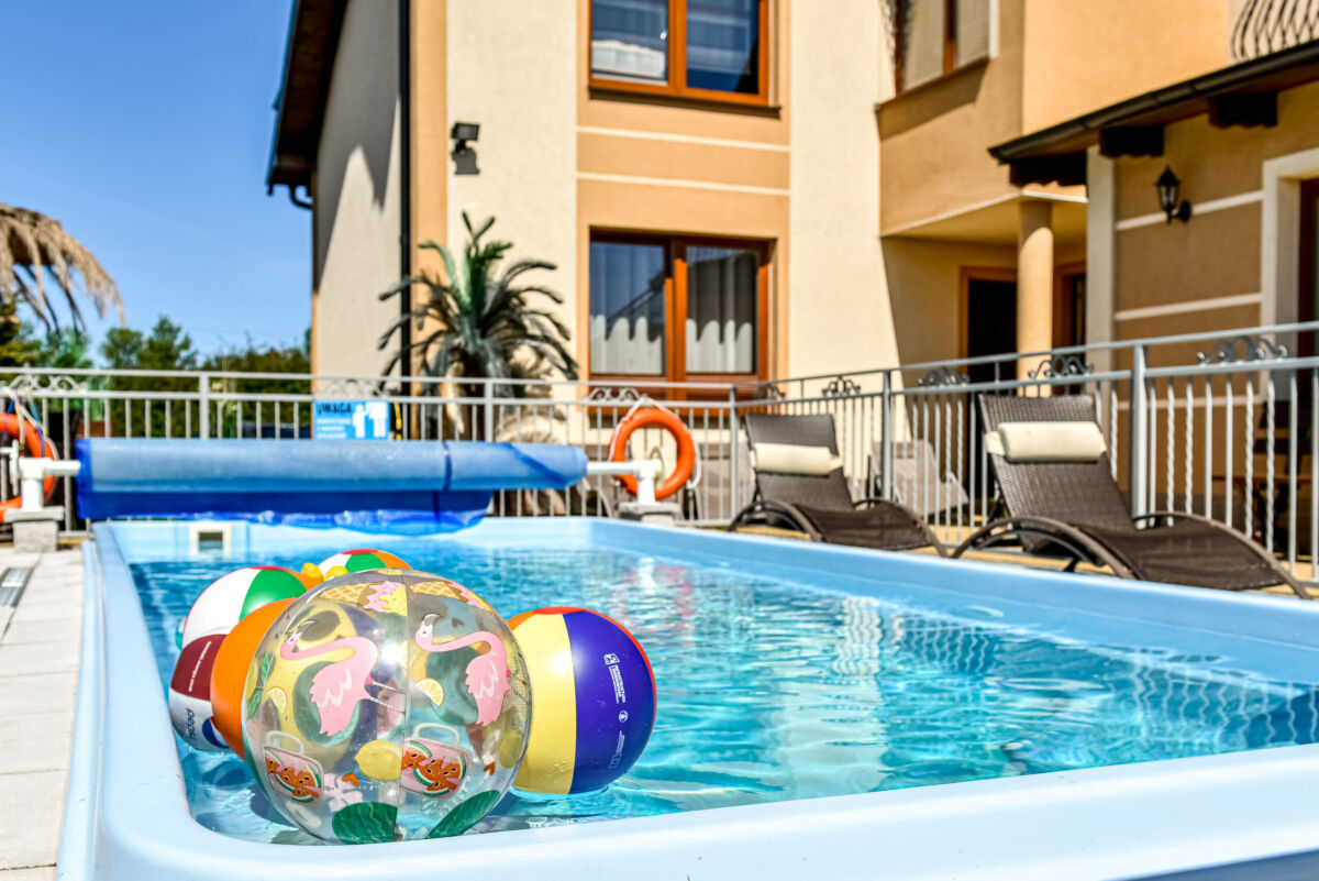 Dysponujemy bardzo nowoczesnym obiektem, z ogrzewanym basenem (temperatura wody ok 30 st.C) posiadającym, luksusowe pokoje - apartamenty, pokoje 2,3,4 osobowe z łazienkami i balkonami, sprzętem plażowym, internetem w każdym pokoju WLAN, na terenie obiektu Wi-Fi (ok 6 Mbit), dużą ogólnodostępną kuchnią na parterze, aneksem kuchennym na poddaszu, lodówkami, dużym placem zabaw z licznymi atrakcjami, dużą altaną na popołudniowe grillowanie. Dodatkowym atutem jest to, iż posesja wraz z dużym parkingiem z kostki na 12 samochodów jest ogrodzona, monitorowana i mieści się w spokojnej i cichej okolicy.