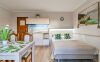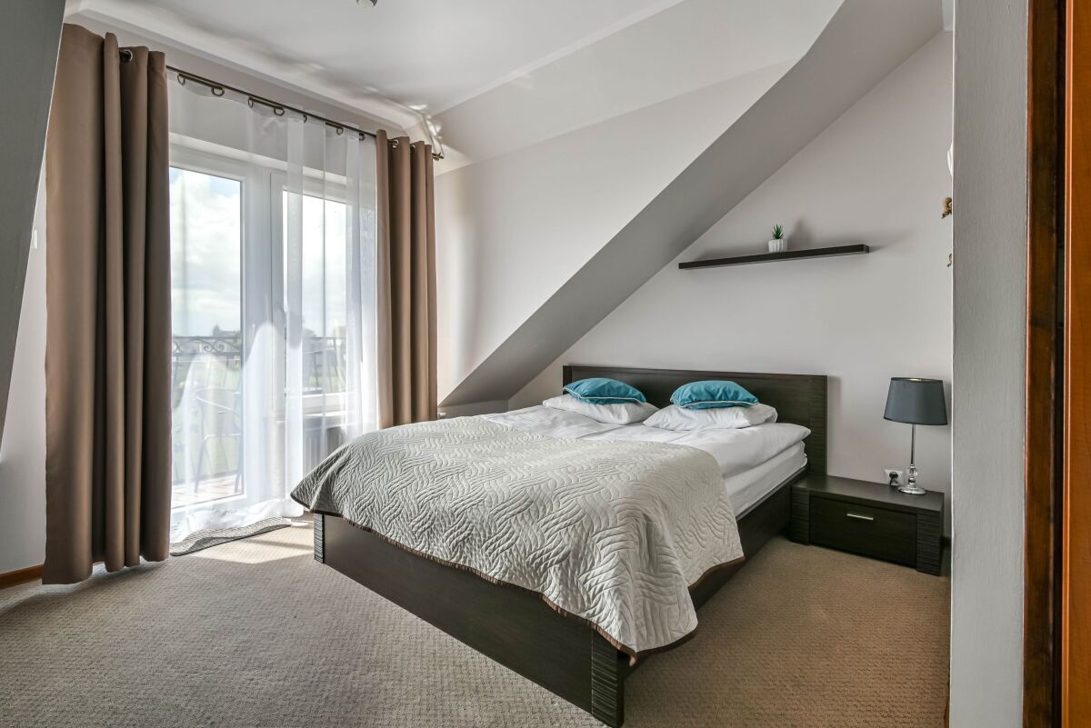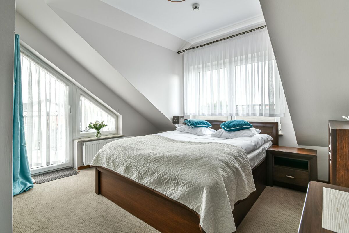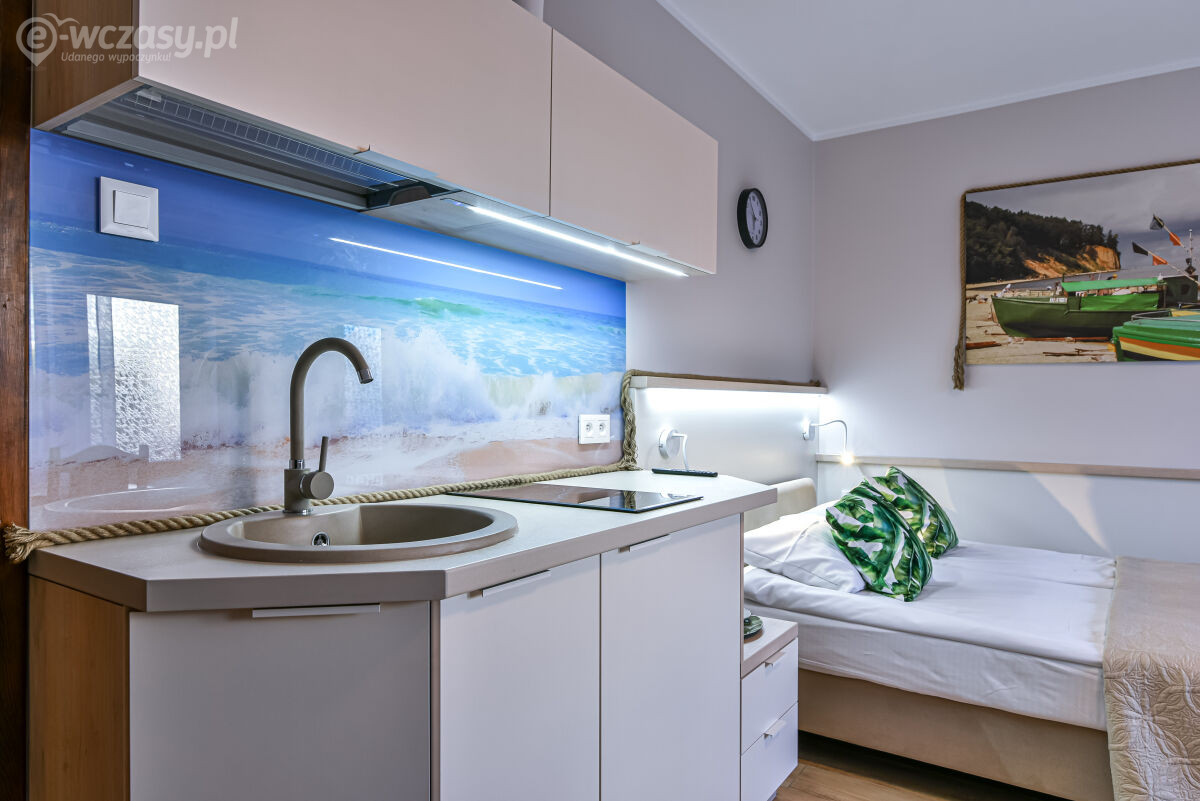* pokoje - 2 osobowe szczególnie urokliwe z dużym łóżkiem małżeńskim mieszczących się na poddaszu, każdy pokój w pełni wyposażony tj: ( łazienka, sprzęt plażowy, czajnik, a także podstawowy zestaw jadalny, swobodny dostęp do aneksu).