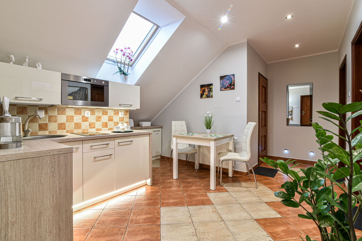 * w pełni wyposażony aneks kuchenny mieszczący się na poddaszu (lodówka, kuchenka mikrofalowa, kuchenka elektryczna, czajnik bezprzewodowy, naczynia itp.),