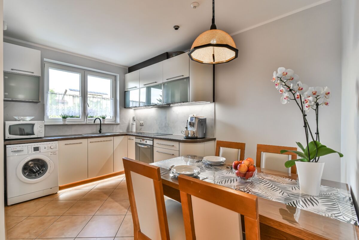 * w pełni wyposażona kuchnia mieszcząca się na parterze (lodówka, kuchenka mikrofalowa, kuchenka elektryczna, płyta gazowa, pralka, czajnik bezprzewodowy, garnki, naczynia itp.),