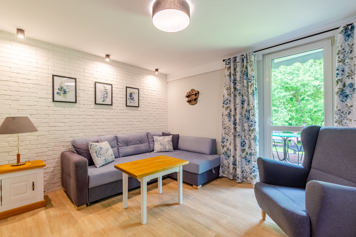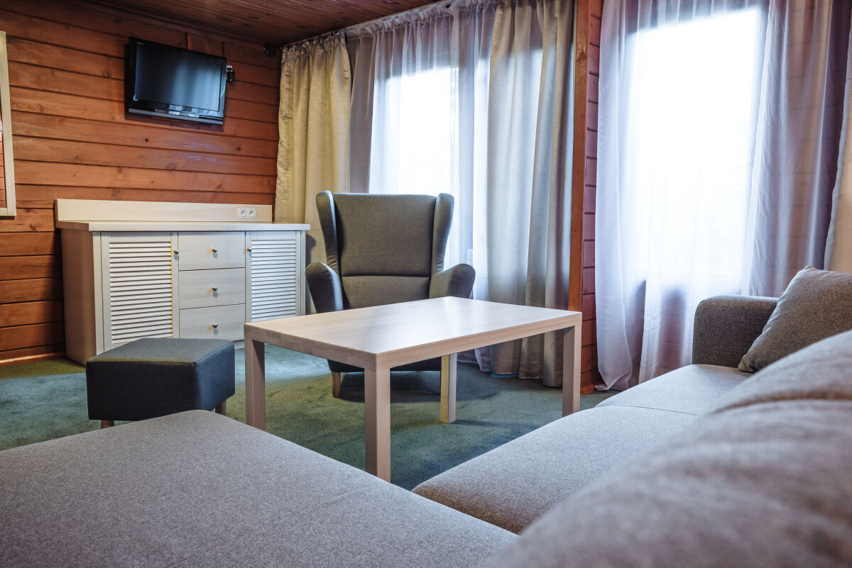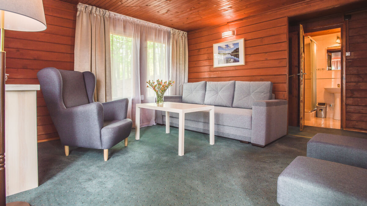 • Domek 6 osobowy z salonem: 2 pokoje 2-osobowe, salon (kanapa 2-osobowa rozkładana, fotel, TV), łazienka (prysznic, WC, umywalka), aneks kuchenny, lodówka, czajnik,
