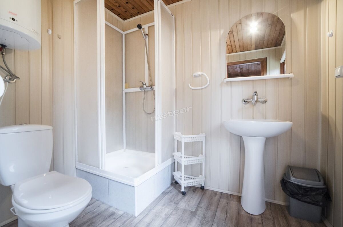 • Domki 5 osobowe z salonem: salon (narożnik 2-osobowy rozkładany, fotel, komoda, TV), pokój 2-osobowy przechodni do pokoju 1-osobowego, łazienka (prysznic, WC, umywalka), aneks kuchenny, lodówka, czajnik,
