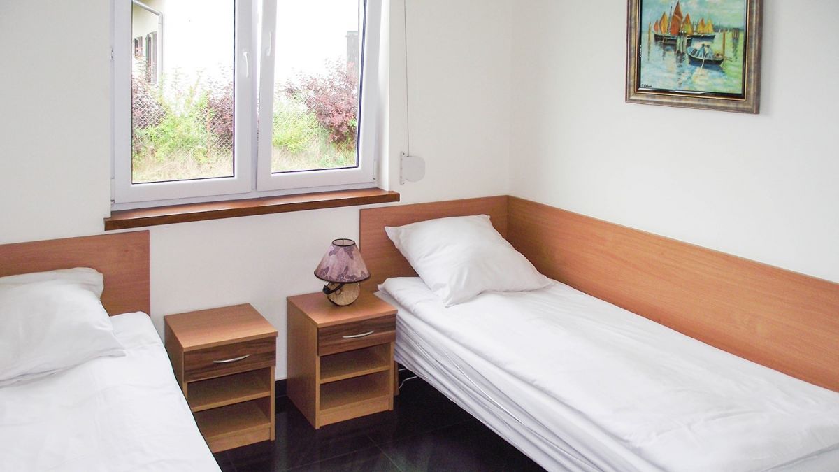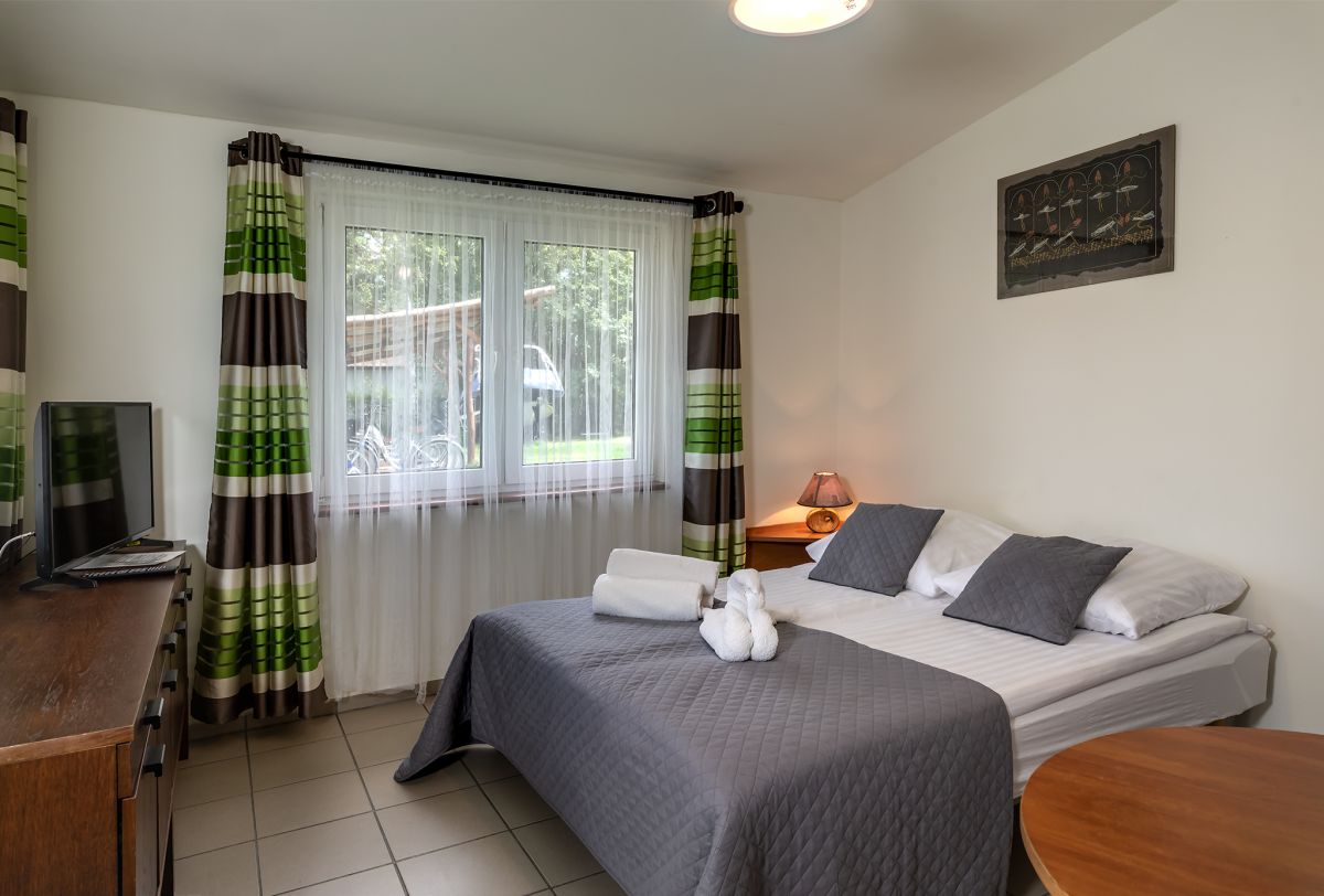 • oraz 2 lub 3 osobowe pokoje z łazienkami, tv, lodówką i otwartym tarasem z meblami ogrodowymi w pawilonie mieszkalnym