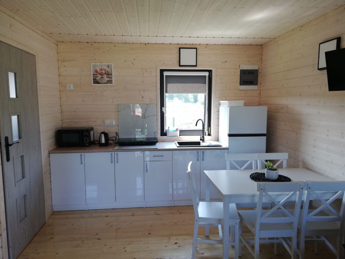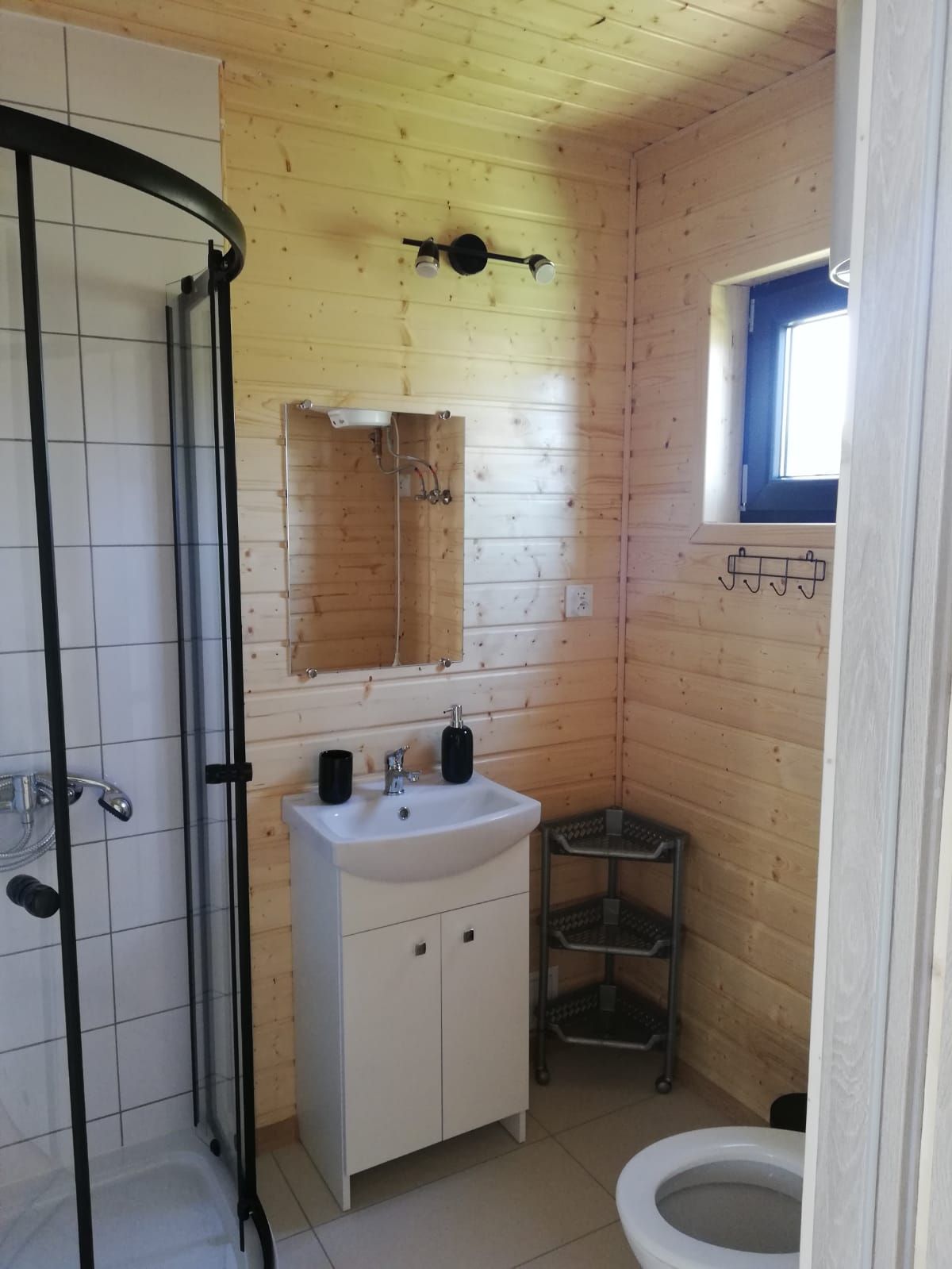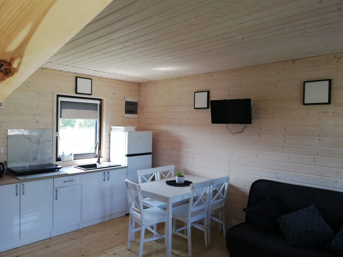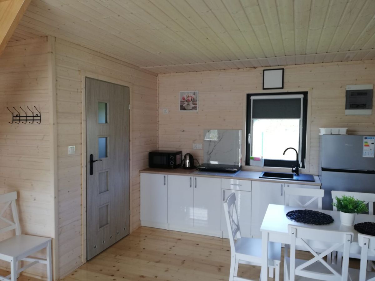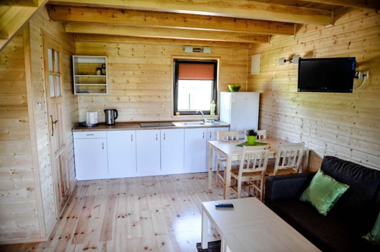 Parter to wygodny pokój dzienny z aneksem kuchennym, łazienką z prysznicem, WC i umywalką. Przed domkiem wygodny taras z meblami ogrodowymi.
