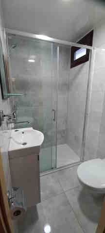 łazienka z kabiną prysznicową, umywalką, WC