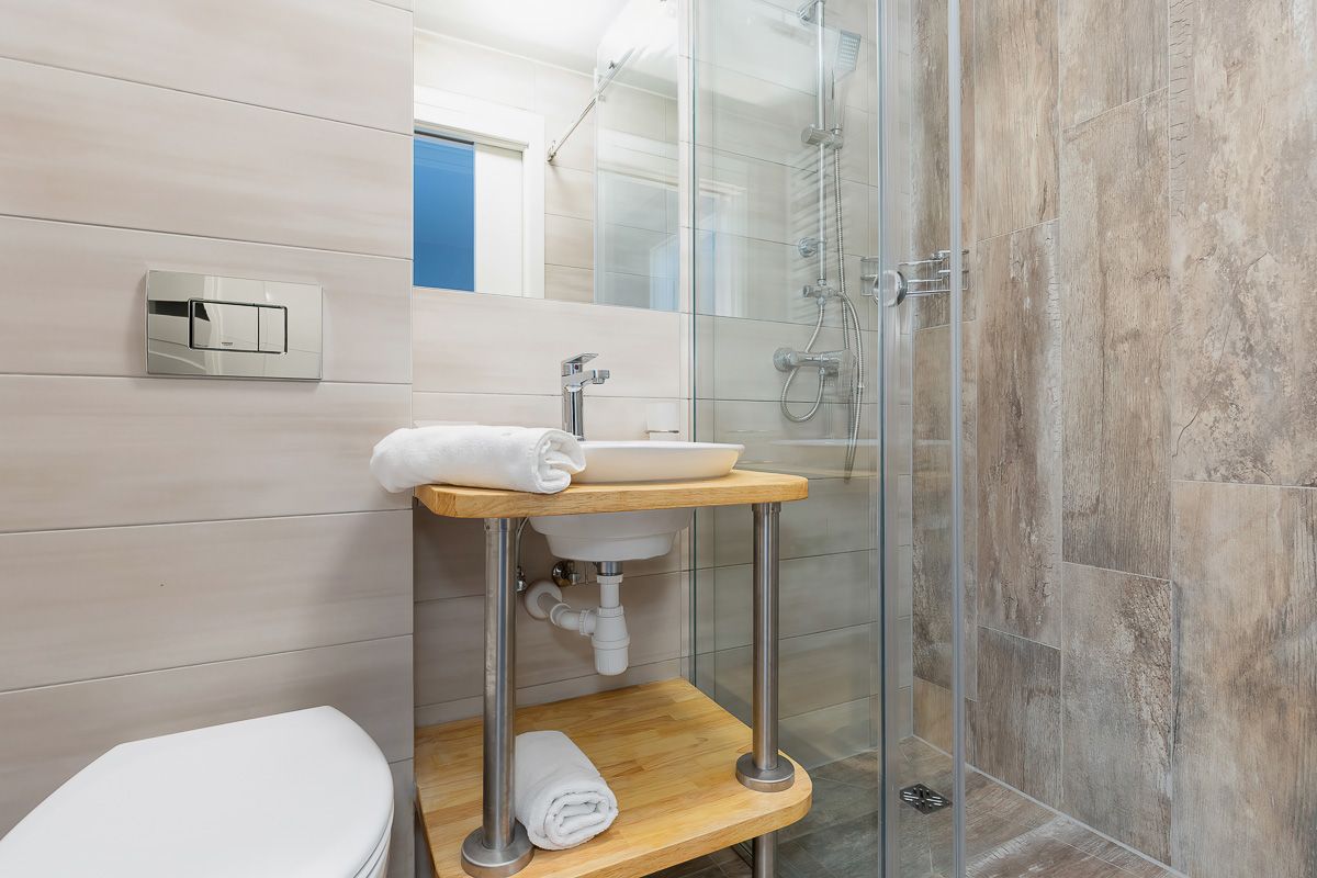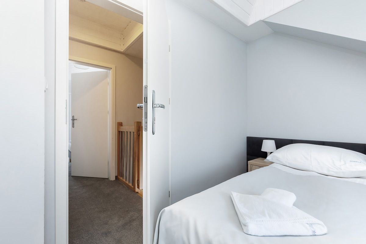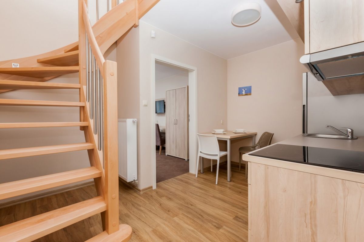 Dwupoziomowe, typu A – o powierzchni 60 m2, wejście na 1. piętrze z galerii, 5-osobowe z możliwością 2 dostawek. Na pierwszym poziomie mieści się pokój dzienny, w pełni wyposażona kuchnia (ze zmywarką, lodówką, kuchenką elektryczną, mikrofalówką i kompletem naczyń), łazienka z kabiną prysznicową oraz taras o powierzchni 11 m2. Na drugim poziomie znajdują się dwie sypialnie oraz dodatkowa toaleta.