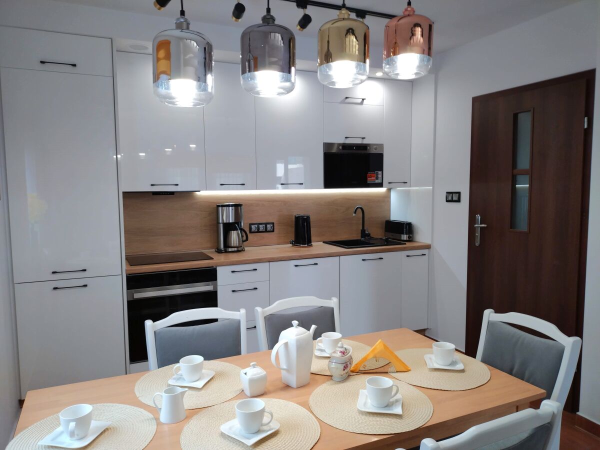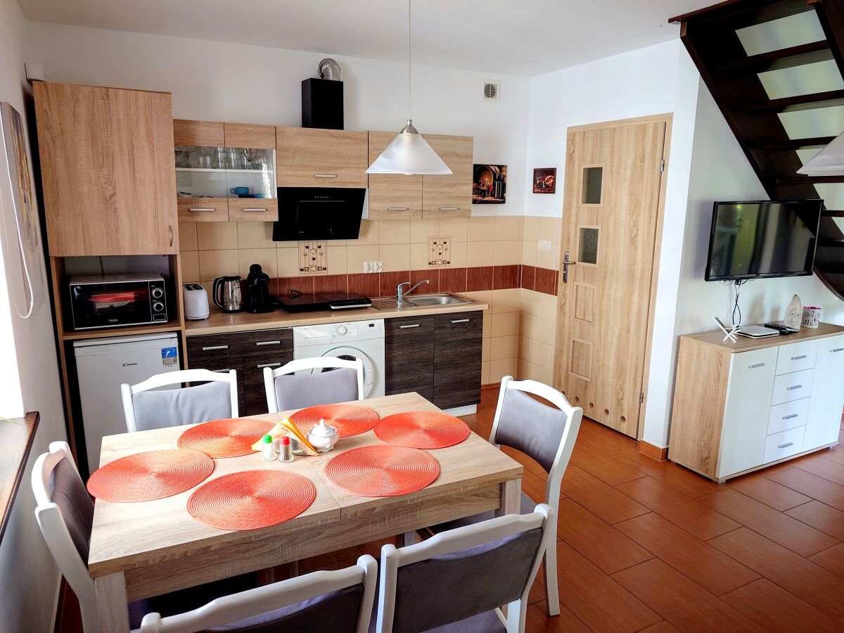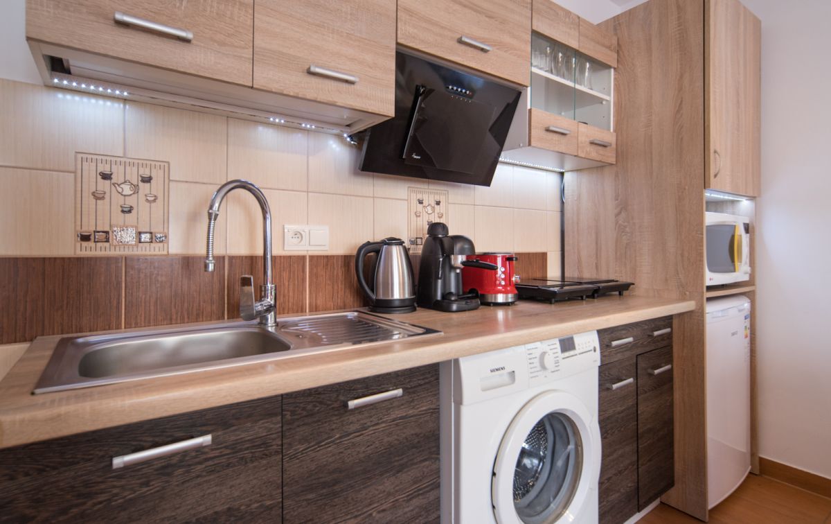 aneks kuchenny z lodówką, pełnym wyposażeniem kuchennym, pralką