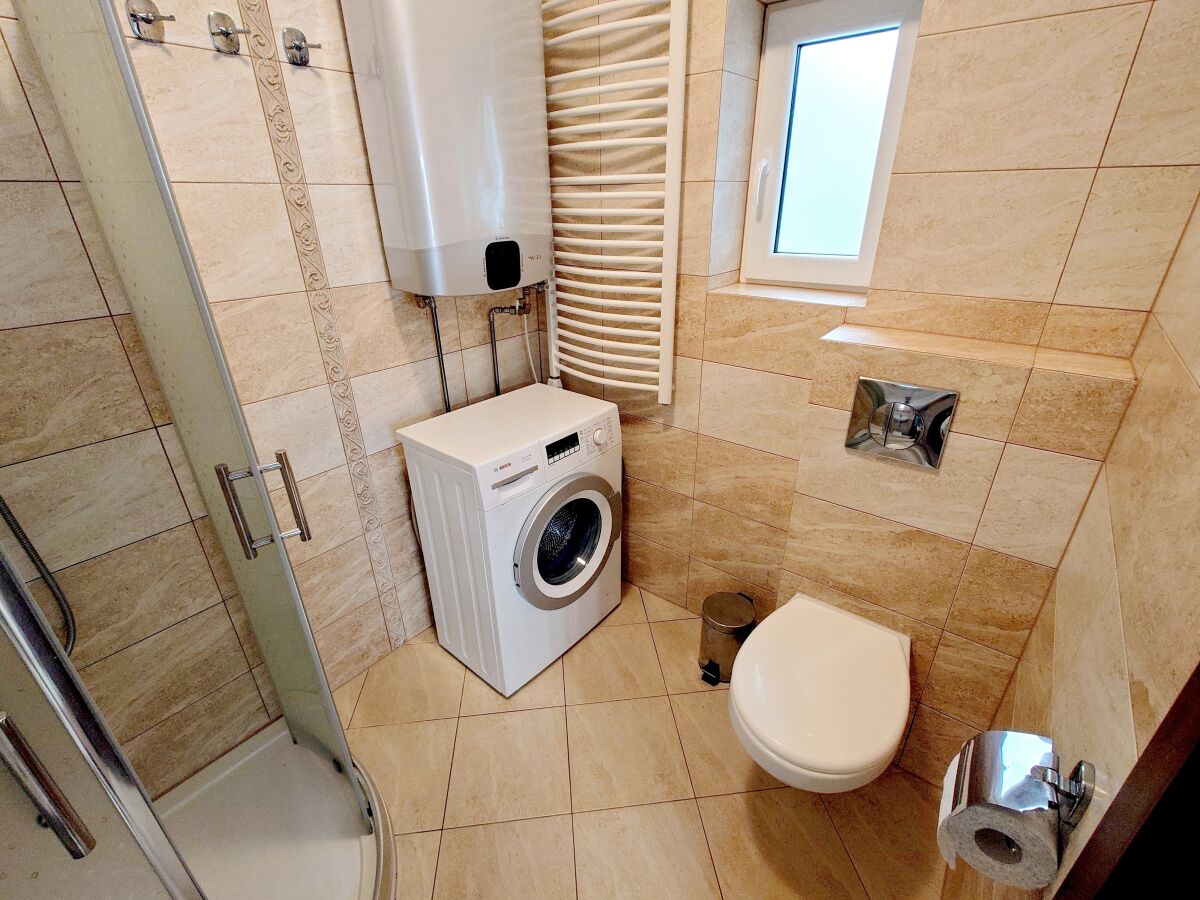 łazienka z kabiną prysznicową, bidetem, umywalką, WC, suszarką drabinkową,