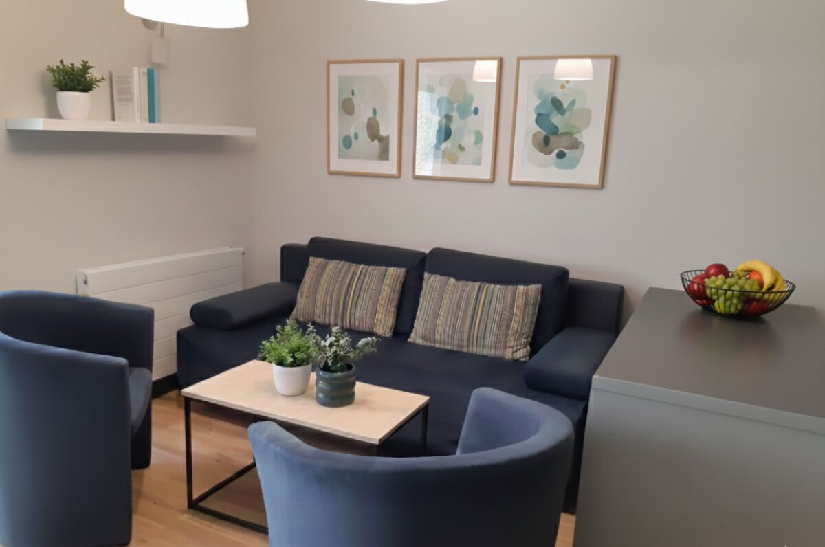 W pokoju dziennym, na parterze znajduje się rozkładana dwuosobowa sofa.