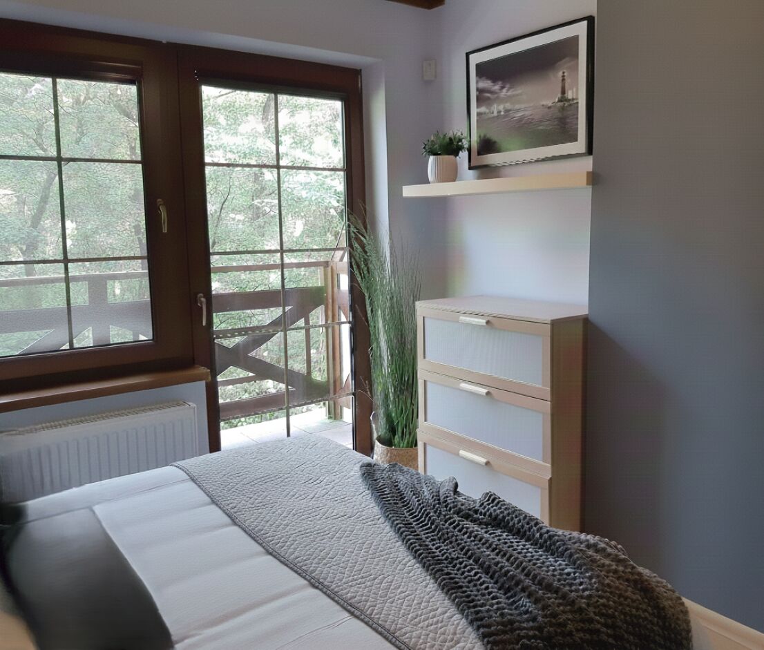 Domek ma bezpośrednie wyjście do ogrodu poprzez ndywidualny zadaszony taras, na którym do Państwa dyspozycji pozostają meble ogrodowe i grill. Widok na zieleń.