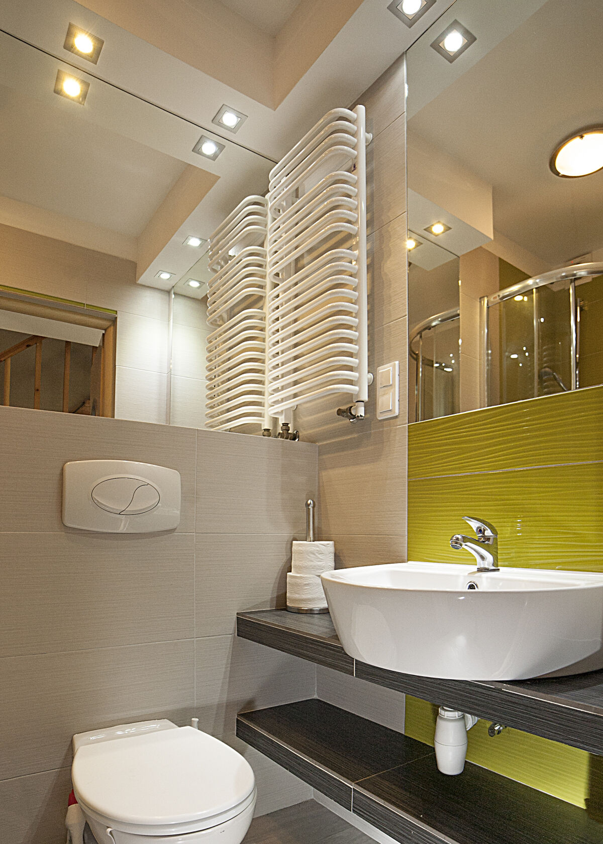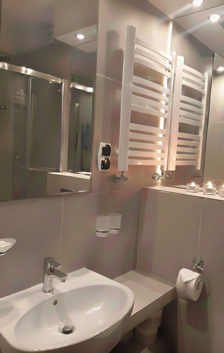 - łazienka z prysznicem, umywalką i WC.