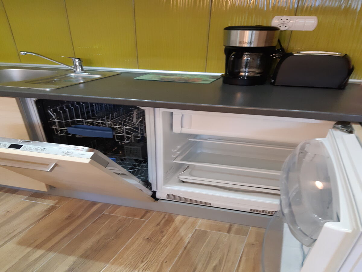 - wyposażenie aneksu kuchennego (kuchenka dwupalnikowa, zlew, lodówka, zmywarka, mikrofalówka, piekarnik mini, czajnik bezprzewodowy, garnki, talerze, sztućce, szklanki, filiżanki, kieliszki, drobne akcesoria kuchenne, środki czystości),