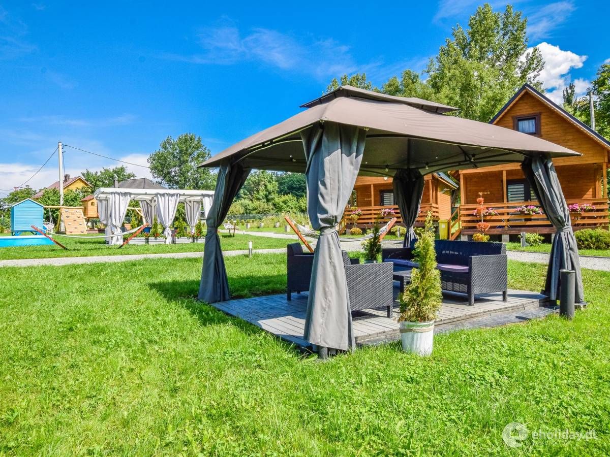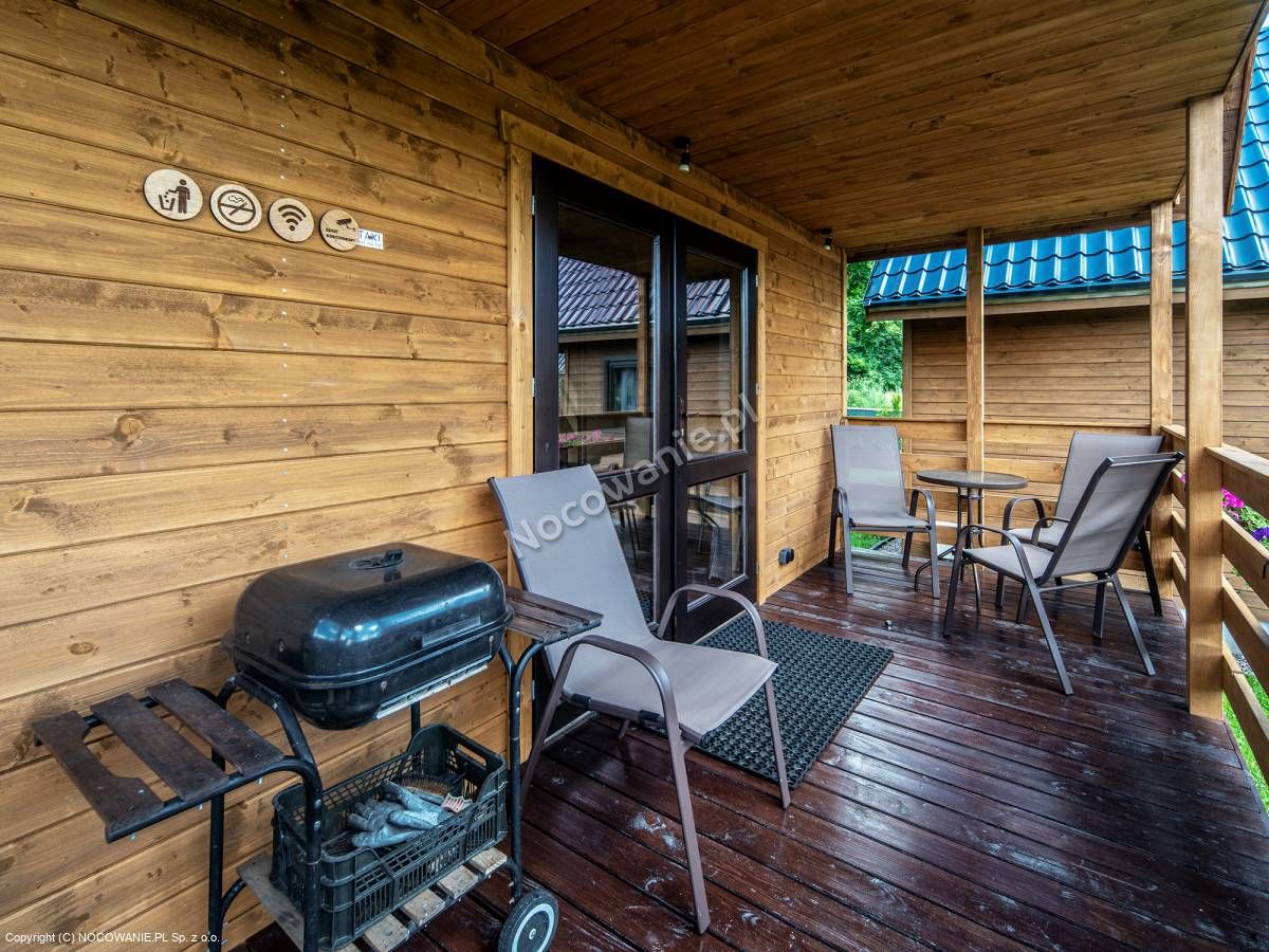 Domki są w pełni wyposażone, posiadają kuchnię z płytą indukcyjną, zmywarką, mikrofalówką, czajnikiem i lodówką, stół z krzesłami, telewizor, wygodną rozkładaną kanapę, nowoczesną łazienkę z natryskiem i deszczownicą, oraz 6-8 miejsc noclegowych z możliwością dostawienia łóżeczka dla dziecka do 3 lat.