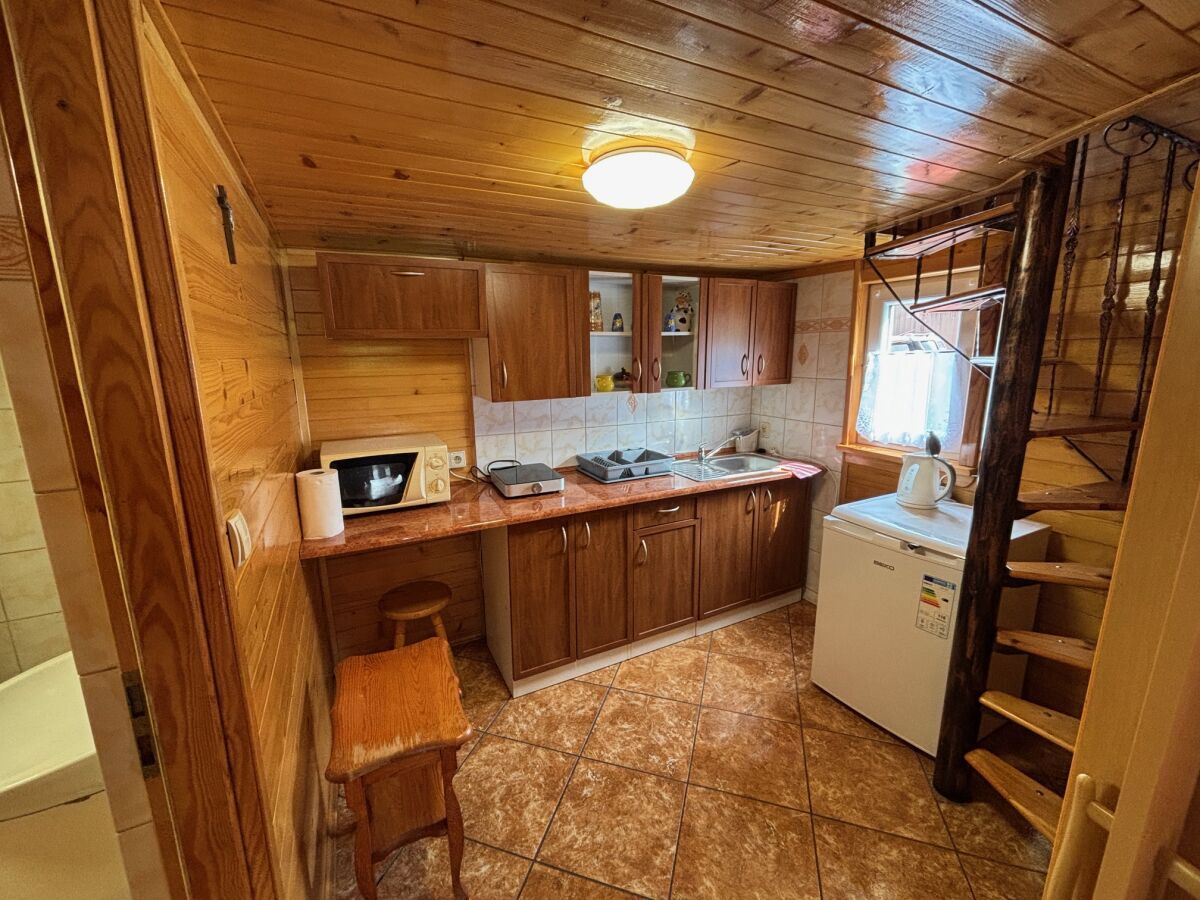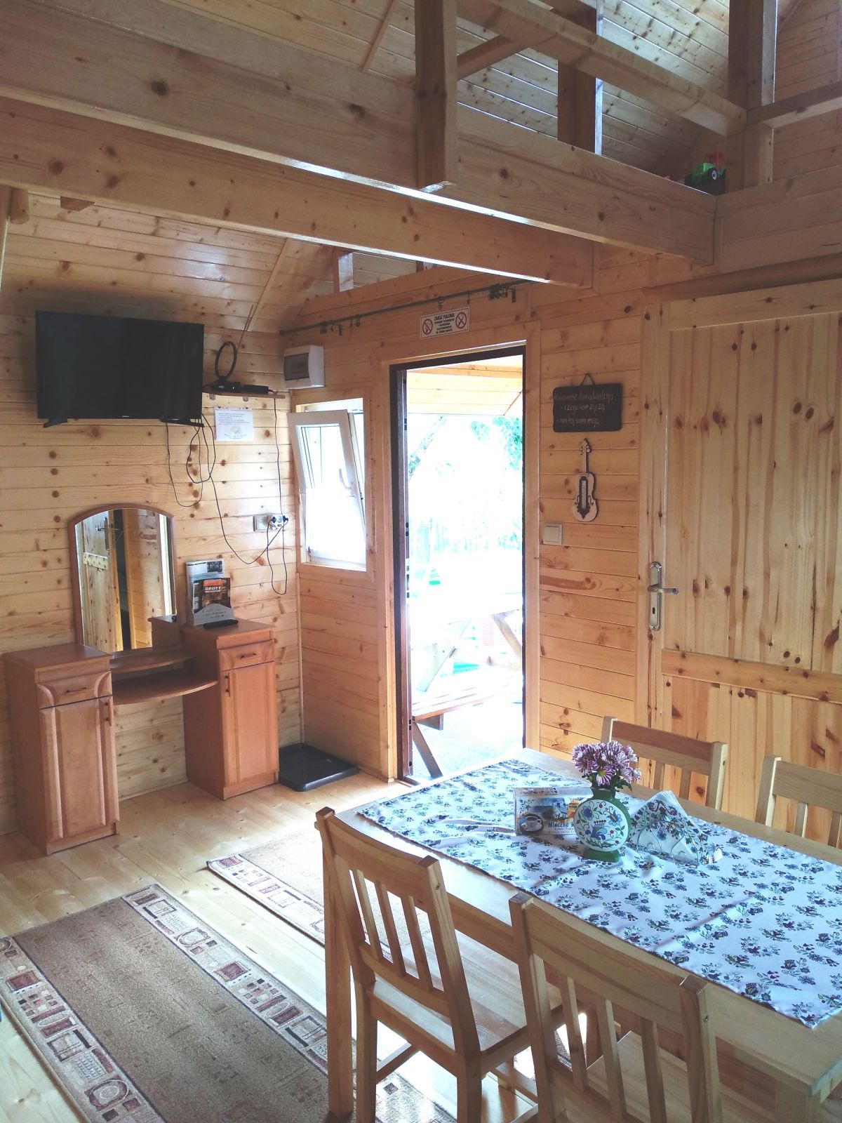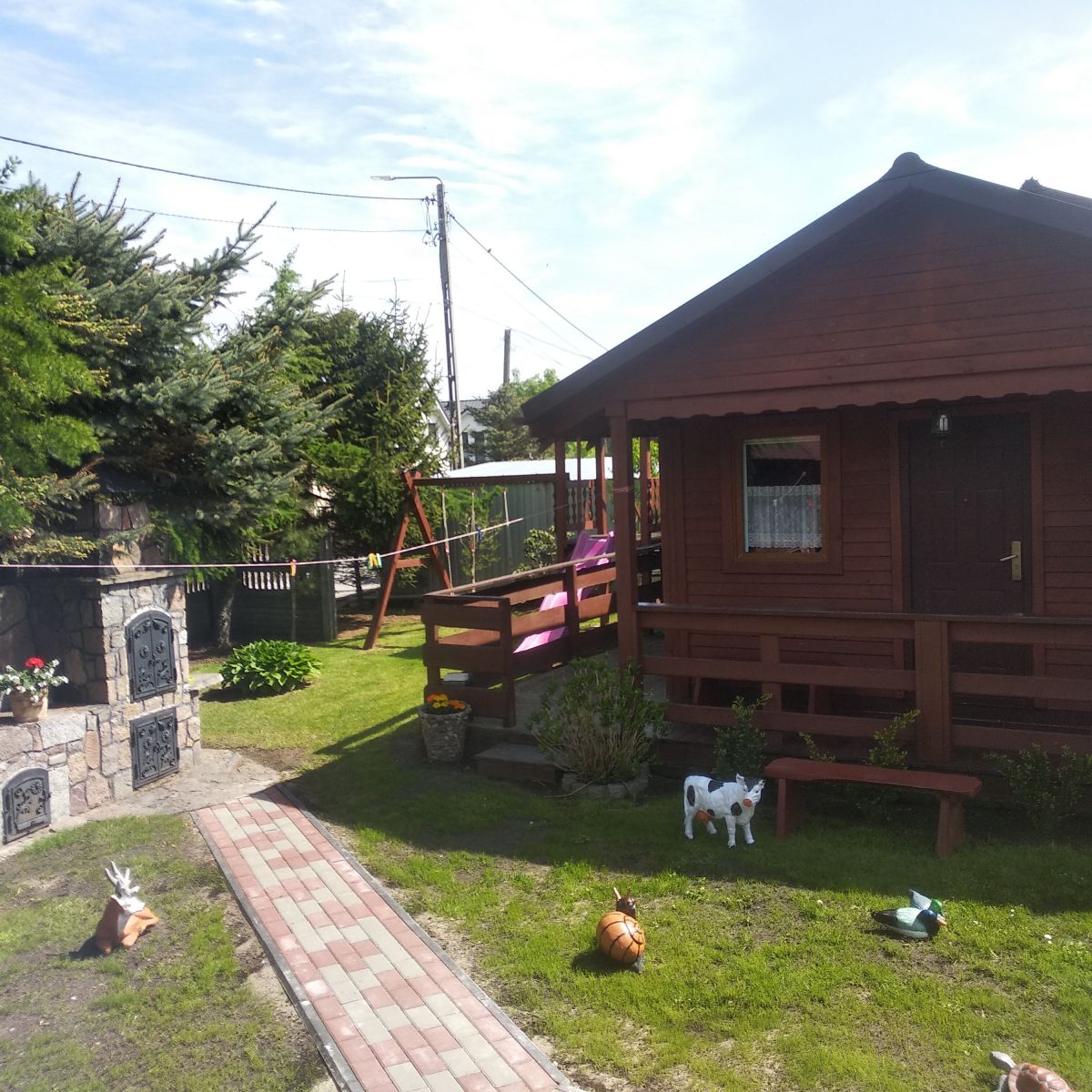 kuchenka, mikrofalówka,czajnik, lodówka, komplet naczyń, sztućców, garnków, pościele, ręczniki,gry, puzzle, zabawki dla dzieci, telewizor, leżaki oraz możliwość wypożyczenia łóżeczka dla dziecka. Cena wynajmu domku do sześciu osób to 300 zł za dobę za domek, każda kolejna osoba to dodatkowo 30 zł za dobę. Nie pobieramy dodatkowych opłat za wodę, prąd i parking. Na terenie posesji znajduje się sklep spożywczy.