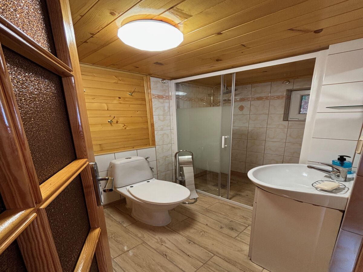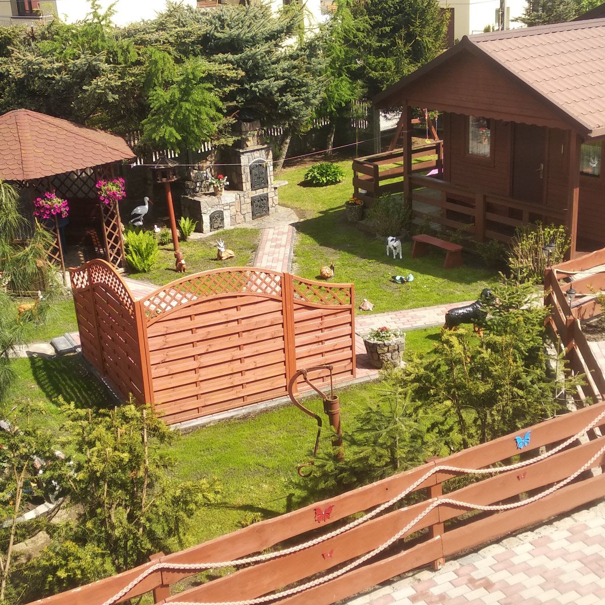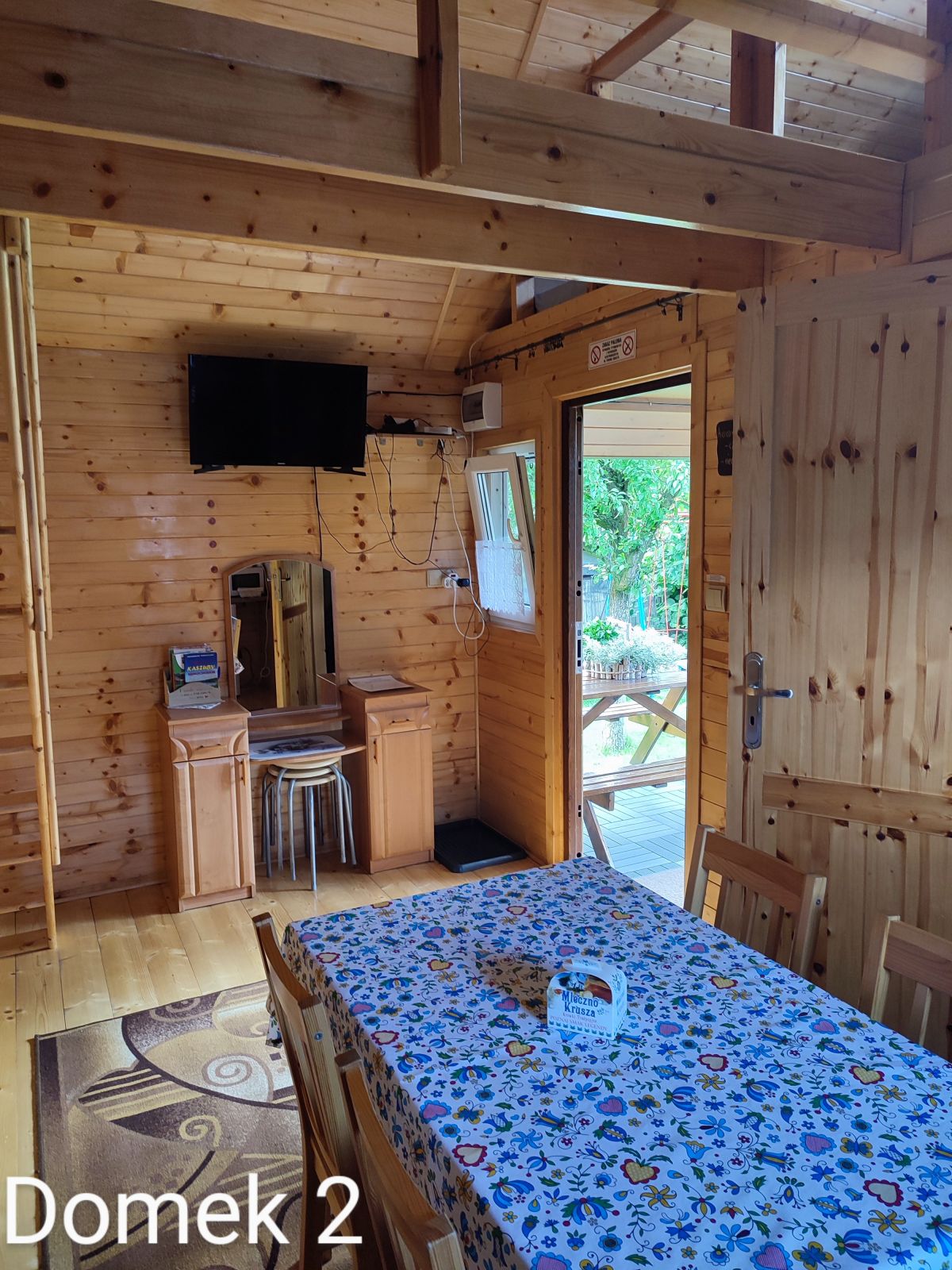Domek nr 1 składa się z salonu dziennego trzyosobowego , pokoju dwuosobowego na poddaszu , kuchni , łazienki, balkonu i tarasu z wyjściem do ogrodu z altanką, grillem i placem zabaw.
