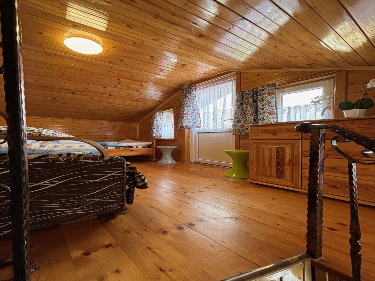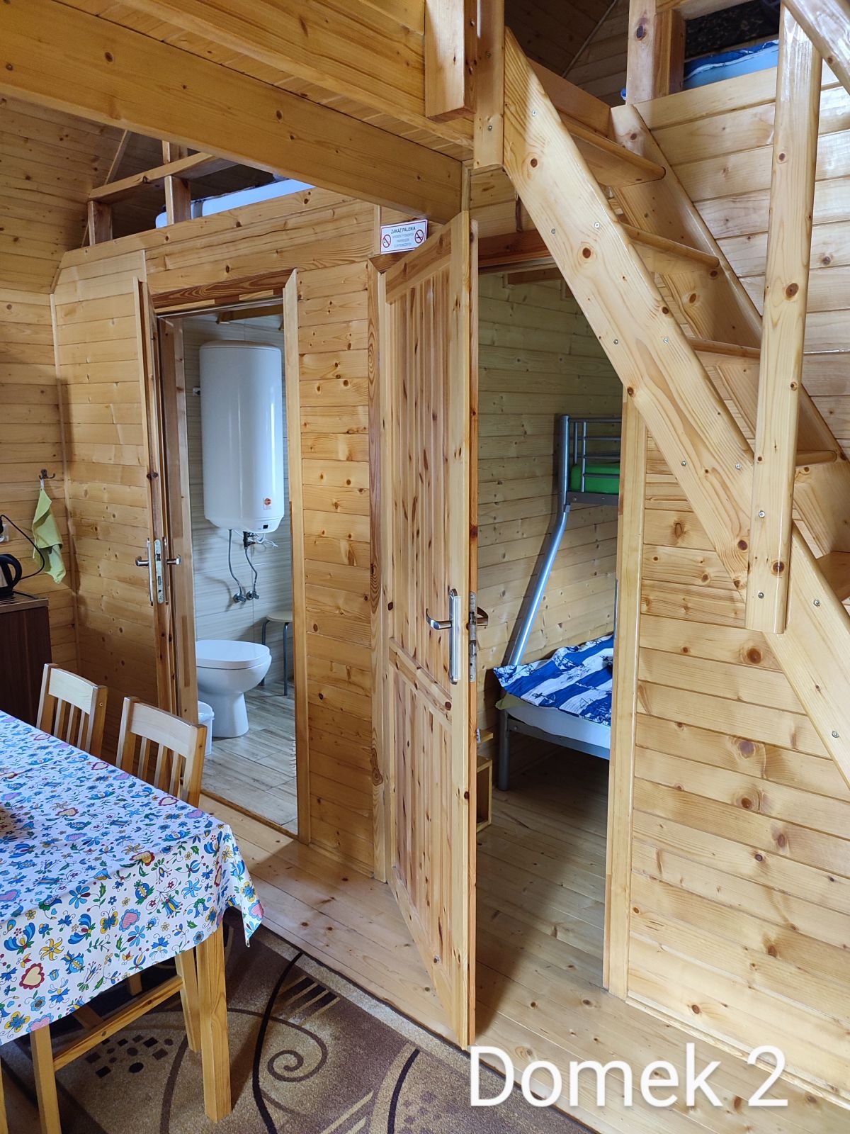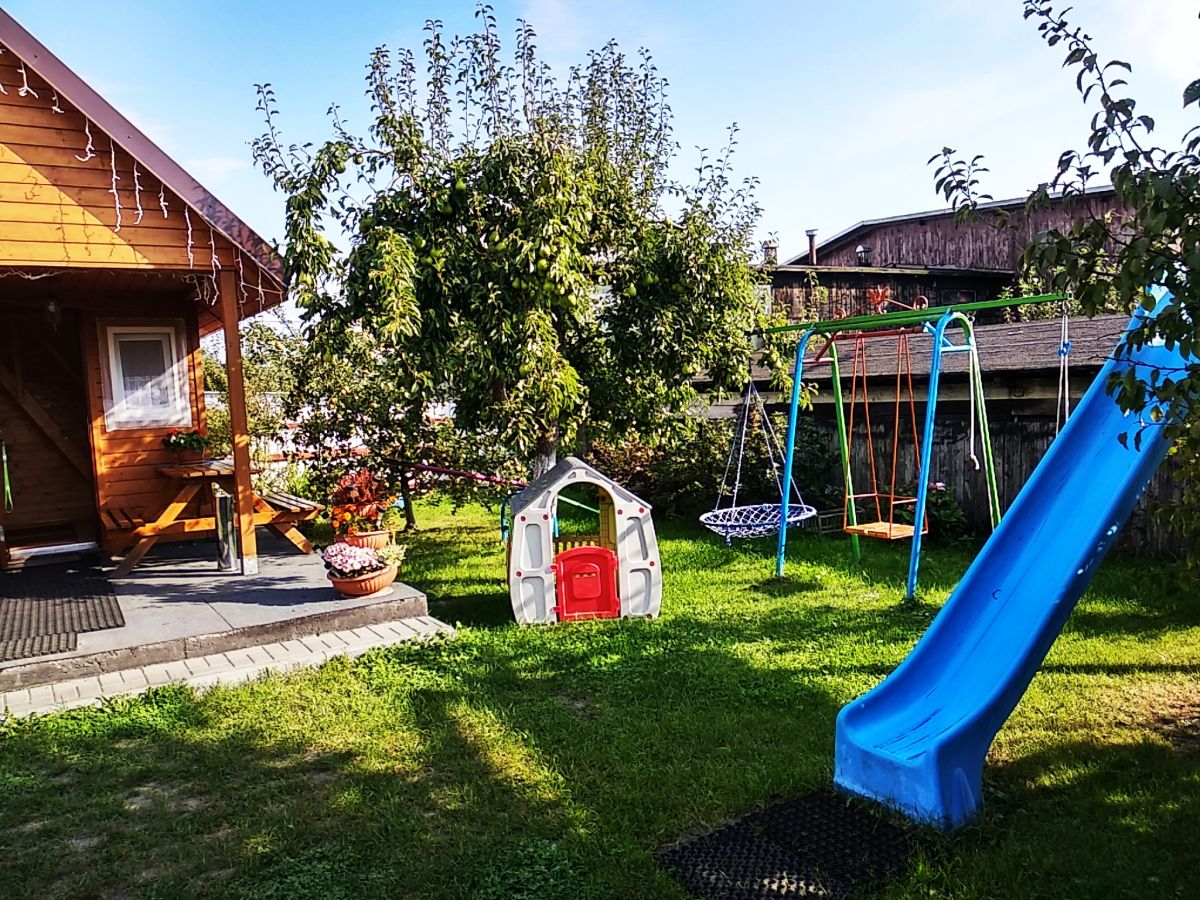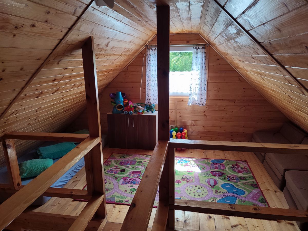 Domek nr 2 to kuchnia z jadalnią, dwie sypialnie trzyosobowe, łazienka, na poddaszu dwie antresole z kącikiem zabaw i możliwością dostawki do spania dla 7 osób. Wyjście z tarasu do ogrodu z placem zabaw oraz altanką z grillem.