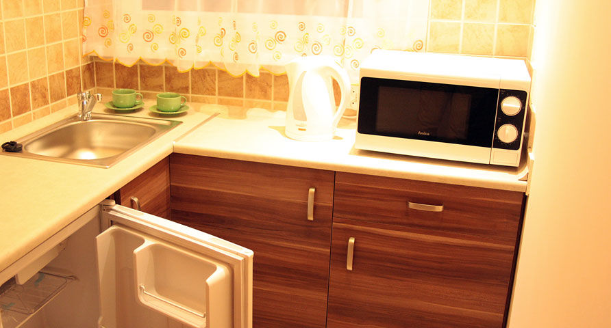 - funkcjonalny aneks kuchenny, wyposażony w lodówkę, kuchenkę mikrofalową, płytę indukcyjną, czajnik bezprzewodowy i zestaw naczyń - tu łatwo przygotujesz posiłek,
