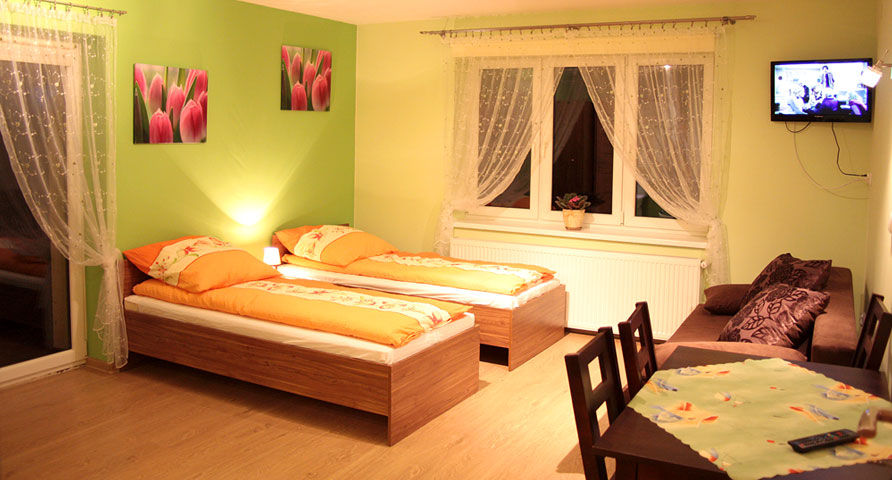 Apartament „Wiosna” - Apartament przeznaczony jest dla 2 do 4 osób. Wyposażony w rozkładaną dwuosobową sofę oraz dwa pojedyncze łóżka z możliwością zestawienia ich w łóżko podwójne.
