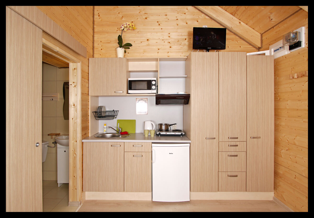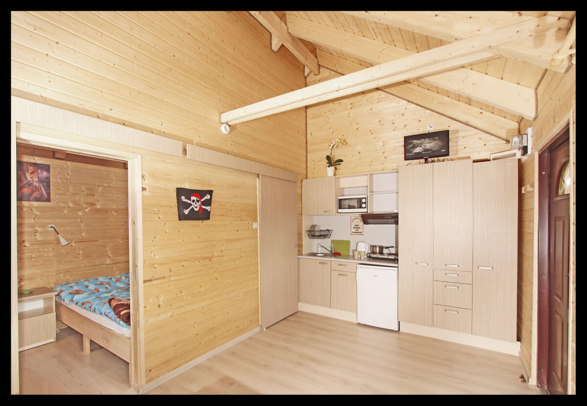 • salon z kompletnie wyposażonym aneksem kuchennym - lodówka, kuchenka elektryczna dwupalnikowa, kuchenka mikrofalowa, naczynia, sztućce, czajnik elektryczny, garnki i patelnia;