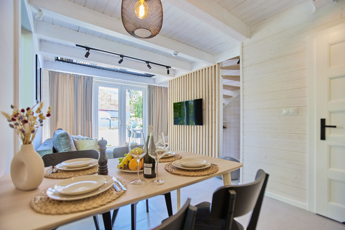 Domki Nautica zostały zbudowane w wysokim standardzie. Użyliśmy materiałów bardzo dobrej jakości, aby każdy z Państwa czuł się u nas wyjątkowo i bezpiecznie. Każdy domek posiada płaskie telewizory LED 50 cali, zabudowę kuchenną, lodówkę, mikrofale, zmywarkę, ekspres do kawy, czajnik bezprzewodowy, płytę elektryczną, sztućce i naczynia. Łazienka wyposażona jest w elegancką przeszkloną kabinę prysznicową. W każdym domku znajdą Państwo pościel oraz świeże ręczniki z naszym logiem. Na terenie obiektu bezpłatny ogrodzony, monitorowany parking oraz wifi w całym obiekcie.