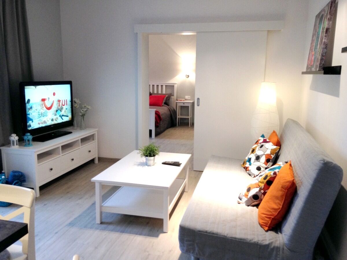 Apartament nr 7, na 1.piętrze, o pow. 48 m2, przeznaczony dla maksymalnie 6 osób, składa się z dwóch pokoi – sypialnia oraz salon z aneksem kuchennym. W salonie znajduje się szeroka kanapa rozkładana dla dwóch osób, w sypialni jest łóżko małżeńskie oraz łóżko rozkładane dla dwóch osób.