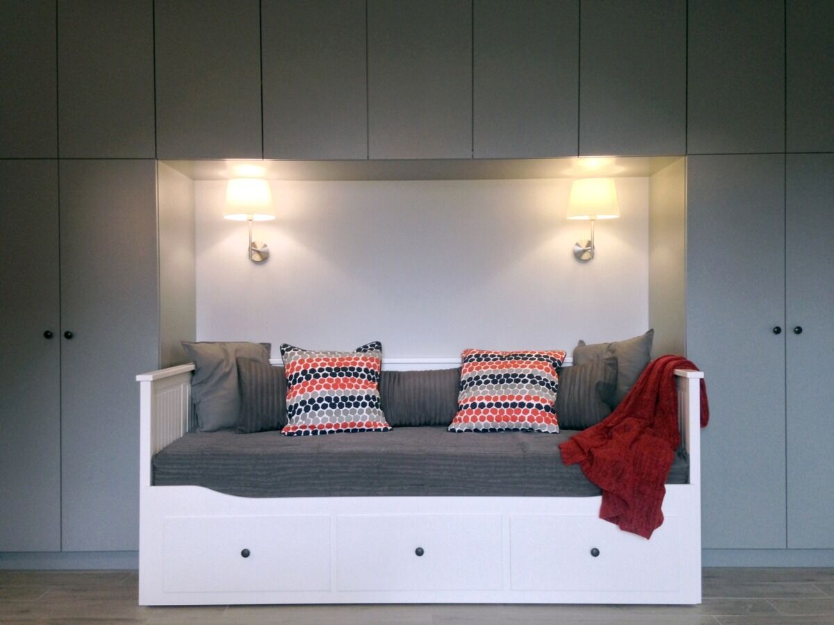 W sypialni jest duża zabudowa meblowa z półkami i dwoma szafami w której można umieścić wszelkie niezbędne rzeczy.