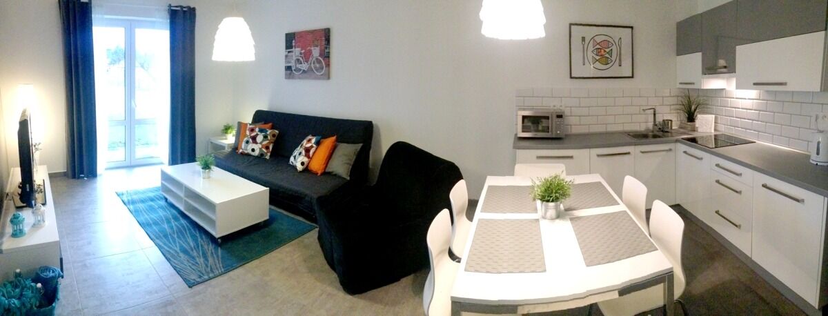 Apartament nr 8, na 1.piętrze, o pow. 40 m2, przeznaczony dla 4, do maksymalnie 6 osób. Apartament składa się z przestronnego salonu z aneksem kuchennym i częścią jadalnianą oraz dużej sypialni w której znajduje się szerokie łóżko oraz wygodna, rozkładana, dwuosobowa sofa (identyczna znajduje się również w salonie). Łazienka z prysznicem wyposażona jest w pralkę. Kuchnia w pełni wyposażona (płyta grzewcza, lodówka, czajnik, naczynia itp). Apartament posiada dwa duże balkony i jest pięknie nasłoneczniony.