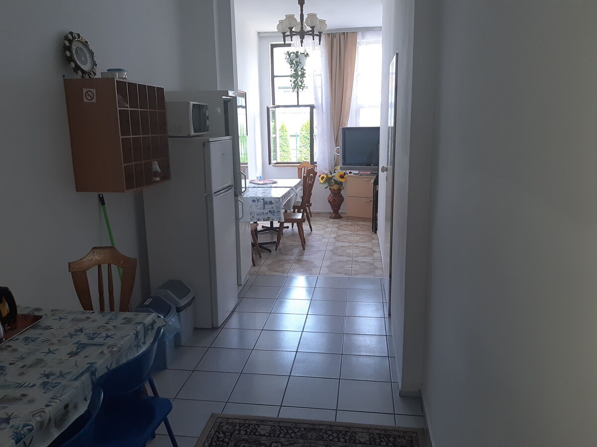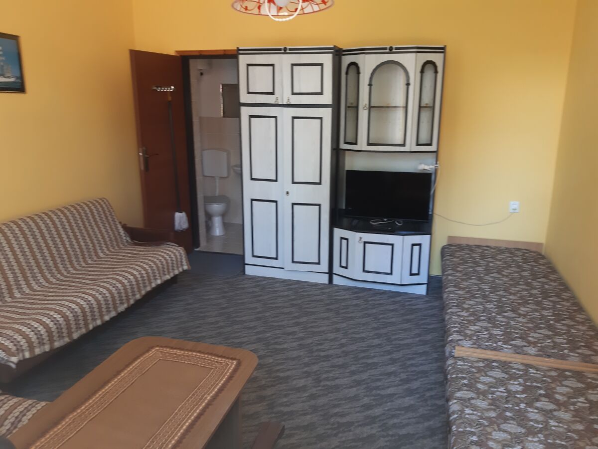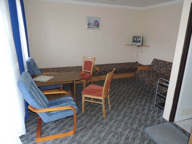 W domu jest 11 pokoi 2, 3, 4, osobowych o różnym standardzie – z łazienkami, z łazienką na piętrze, z balkonami i bez balkonu oraz dwupokojowe. Pokoje wyposażone są w wersalkę i tapczaniki jednoosobowe, telewizor, radio, parawan, koc plażowy. W obiekcie znajduje się ogólnodostępny aneks kuchenny wyposażony w lodówki, kuchenkę elektryczną i mikrofalową itp.