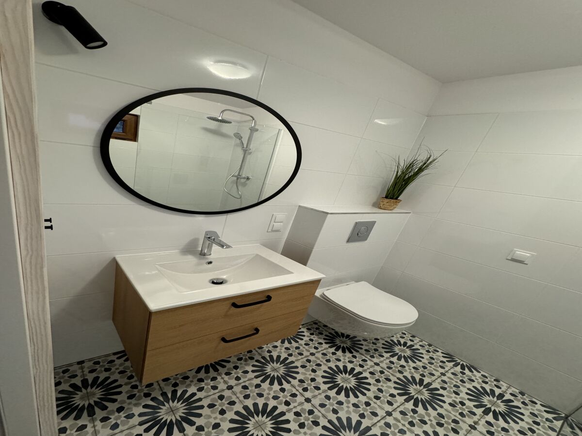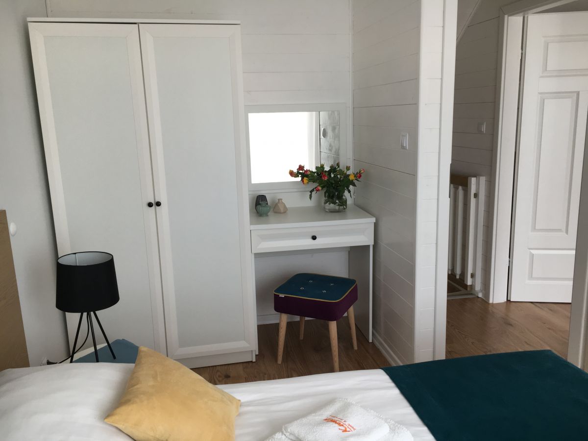 Na piętrze dwie oddzielne, zamykane sypialnie: sypialnia (w każdej 1 łóżko podwójne 160cm i 1 łóżko pojedyńcze 90cm, komoda, szafki nocne, lampki), pościel dla każdej osoby; szafa z półkami; ogrzewanie elektryczne