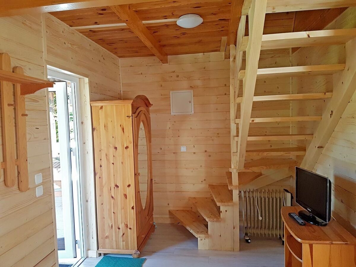 Na parterze domku znajduje się salon z dwuosobową rozkładaną kanapą oraz telewizorem.
