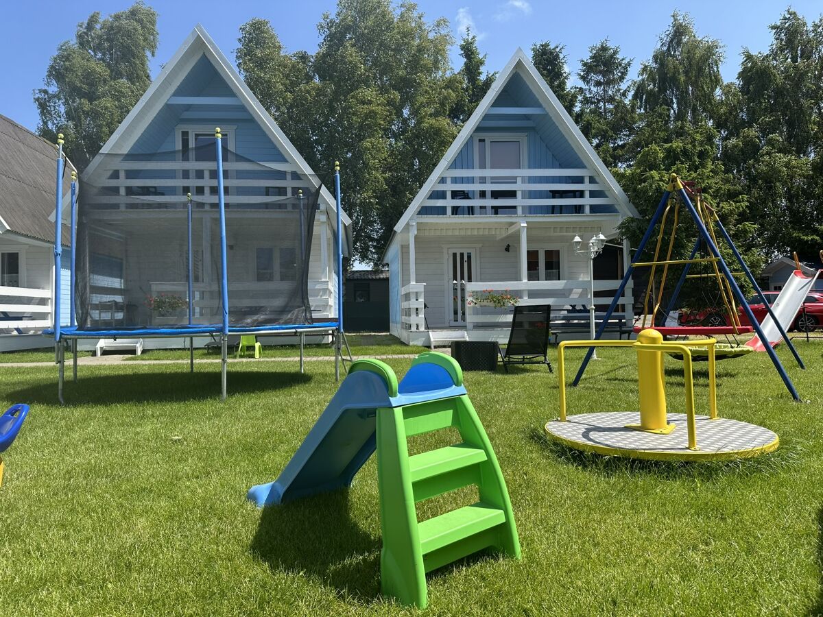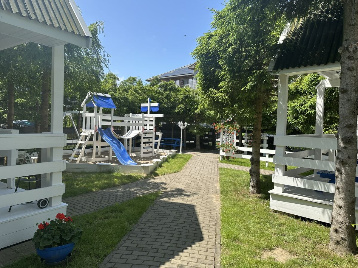 Dzieci mogą bezpiecznie bawić się na ogrodzonej posesji, gdzie znajdą piaskownicę, huśtawki, zjeżdżalnię, trampolinę oraz domek zabaw.