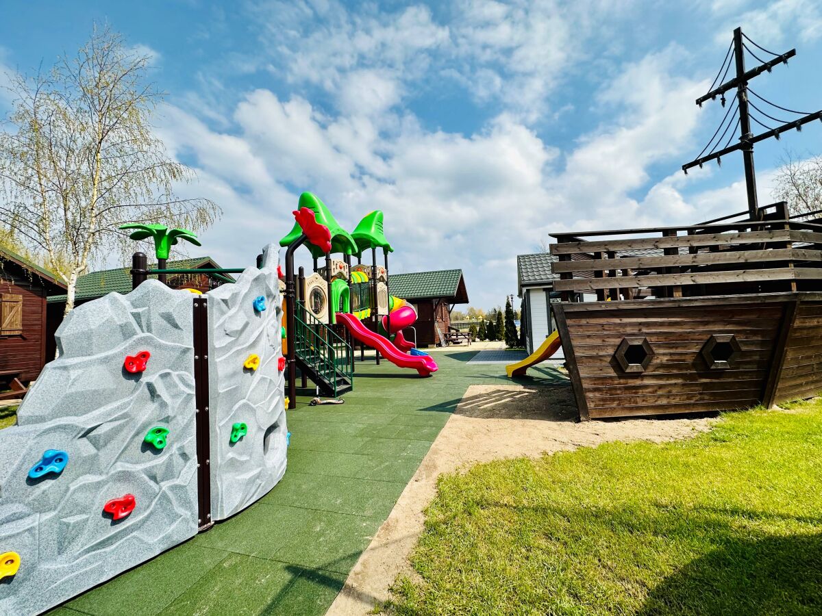 Cały kompleks domków jest ogrodzony i chroniony. Nasz obiekt to idealne miejsce wypoczynku dla rodzin z dziećmi. Bezpieczny i komfortowy. Z myślą o najmłodszych gościach przygotowaliśmy kolorowy BAJKOWO PIRACKI FIGLO RAJ z atrakcjami dostosowanymi do dzieci w różnym wieku: Rycerski Zamek dla małych rycerzy i księżniczek, Chatka Kubusia Puchatka, Piaskownica w kształcie Statku, huśtawka dla maluszków, huśtawki dla dzieci starszych, zjeżdżalnia dla maluszków, zjeżdżalnie dla dzieci od lat 3, duża trampolina, drewniane konstrukcje do wspinania, Domek na Drzewie oraz ... WIELKI STATEK PIRACKI (6,5m). Figlo Raj położony w pięknym, zakątku naszego obiektu, widoczny z większość naszych domków.