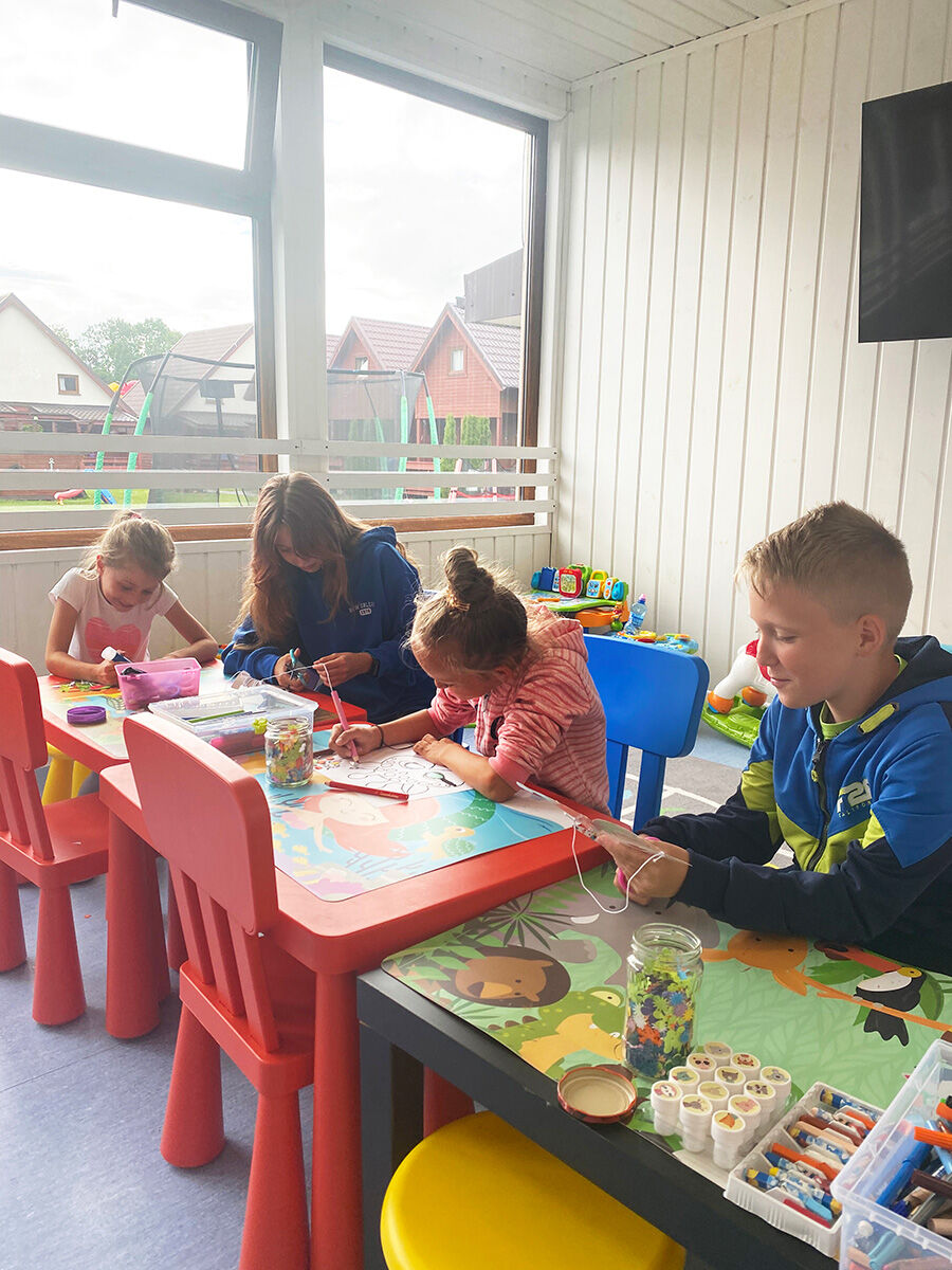 • plac zabaw (trampolina, huśtawki, zjeżdżalnia, piaskownica + zabawki),