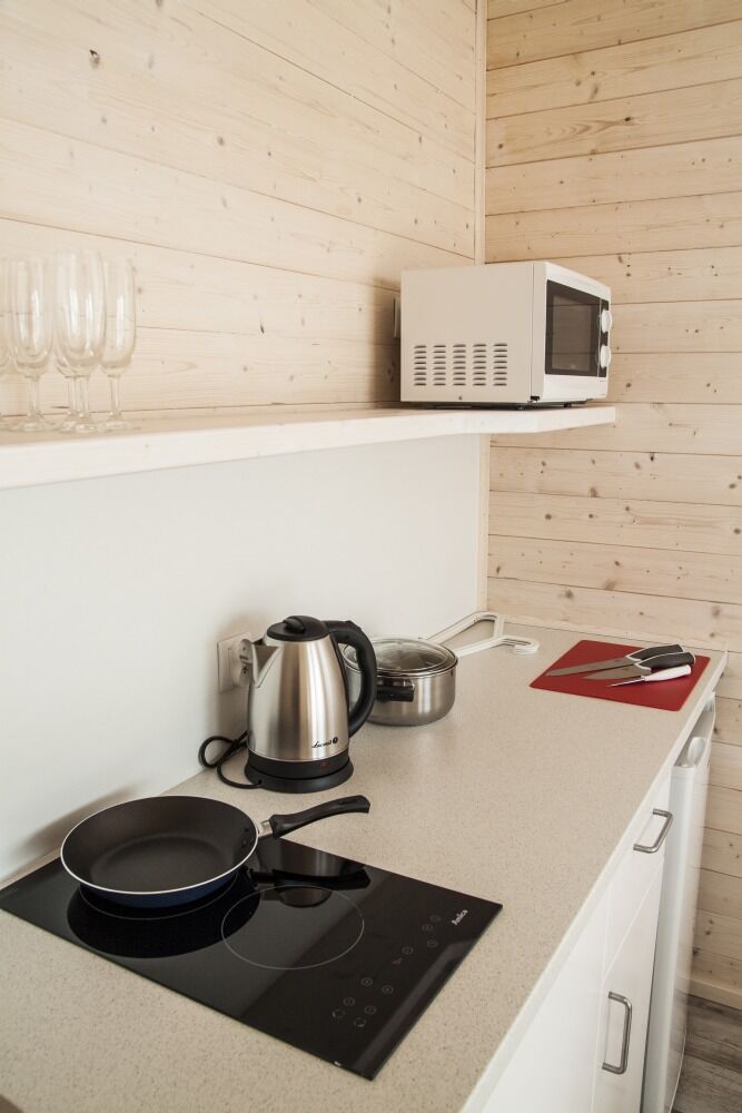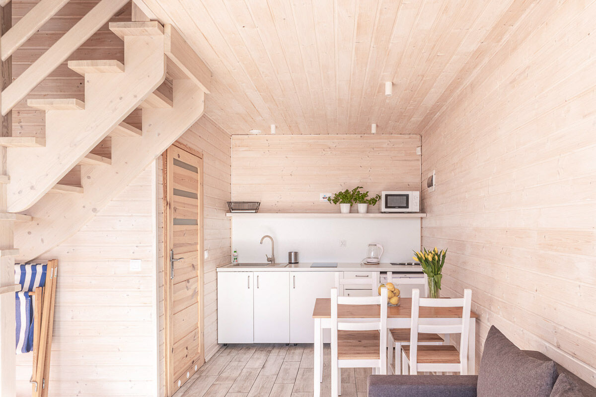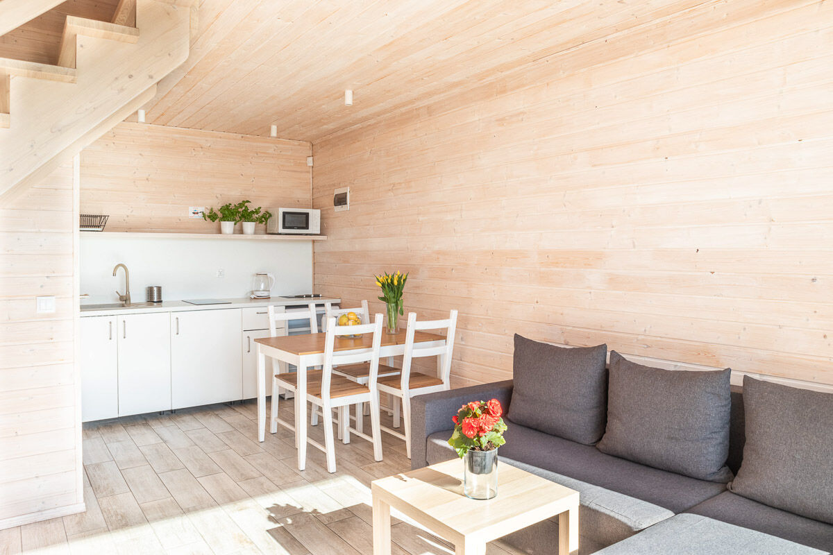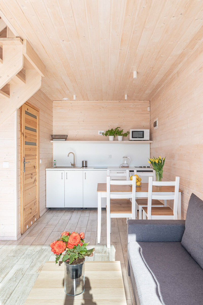 Parter domku: salon gościnny (kanapa, ława i TV), stół, 4 krzesła, aneks kuchenny (lodówka, komplet naczyń, sztućców i garnków dla 6-ciu osób, płyta elektryczna, czajnik, mikrofala, toster, ekspres do kawy) i łazienka.