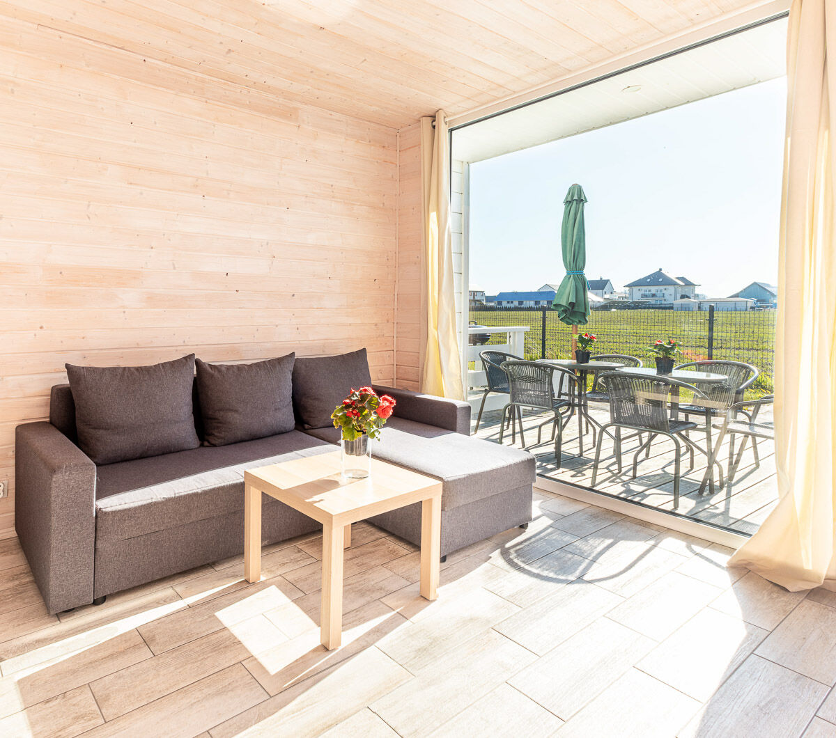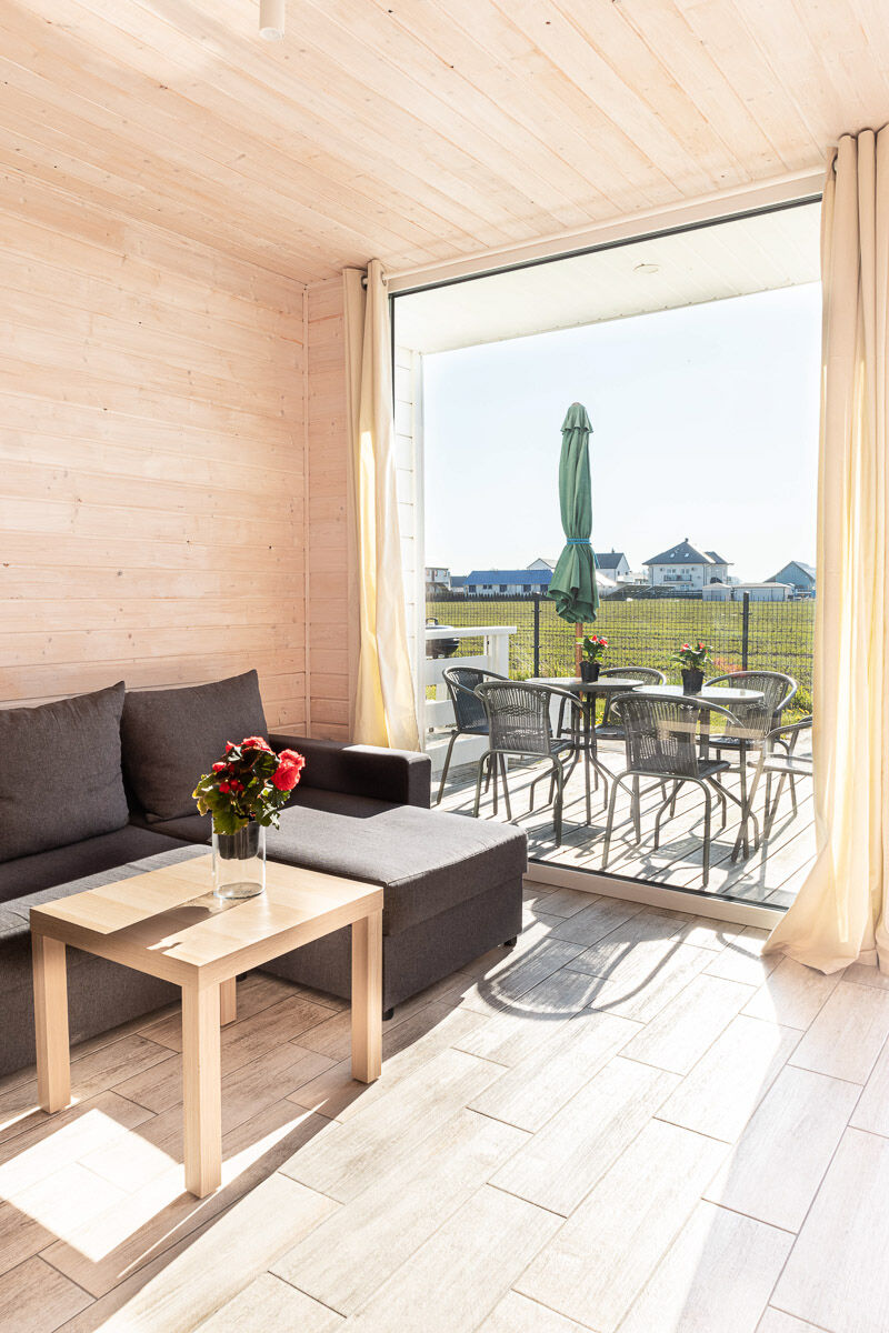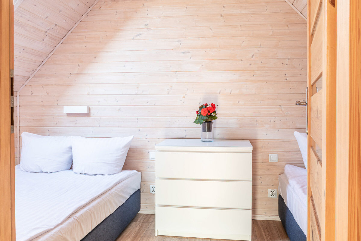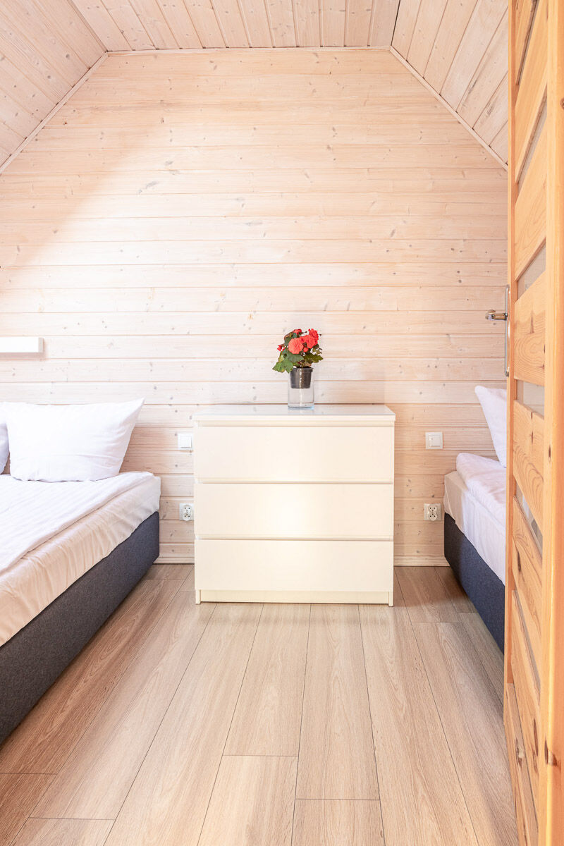 Do dyspozycji gości w ośrodku oddajemy 8 drewnianych, komfortowych domków o powierzchni 41,5 m2 + taras, 6 osobowych (dwie sypialnie z wygodnymi materacami i kompletem pościeli oraz salon)