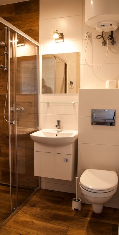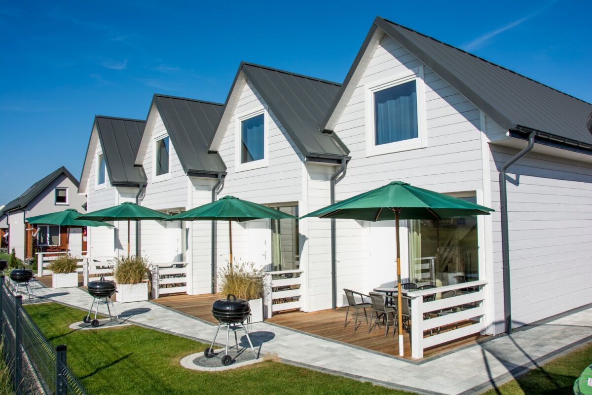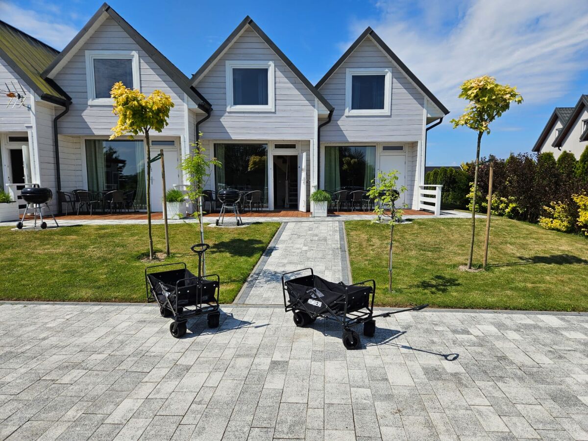 Na zewnątrz: przed każdym domkiem znajduje się duży taras z meblami ogrodowymi, oraz wyznaczone miejsce z grillem ( dla każdego domku do dyspozycji własny grill)